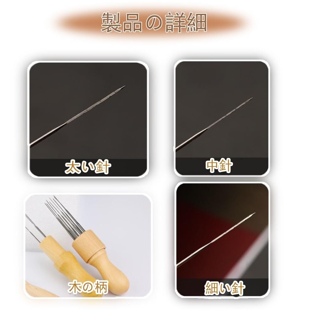 この製品について 初心者向け万能ツールセット きり・ニードル・握り鋏・指ぬき・木製ニードルホルダーなど、羊毛フェルト制作に必要な工具を網羅。 60本の専用針(太・中・細の3サイズ)を付属し、高速刺し・形状固定・微細加工の全工程に対応。