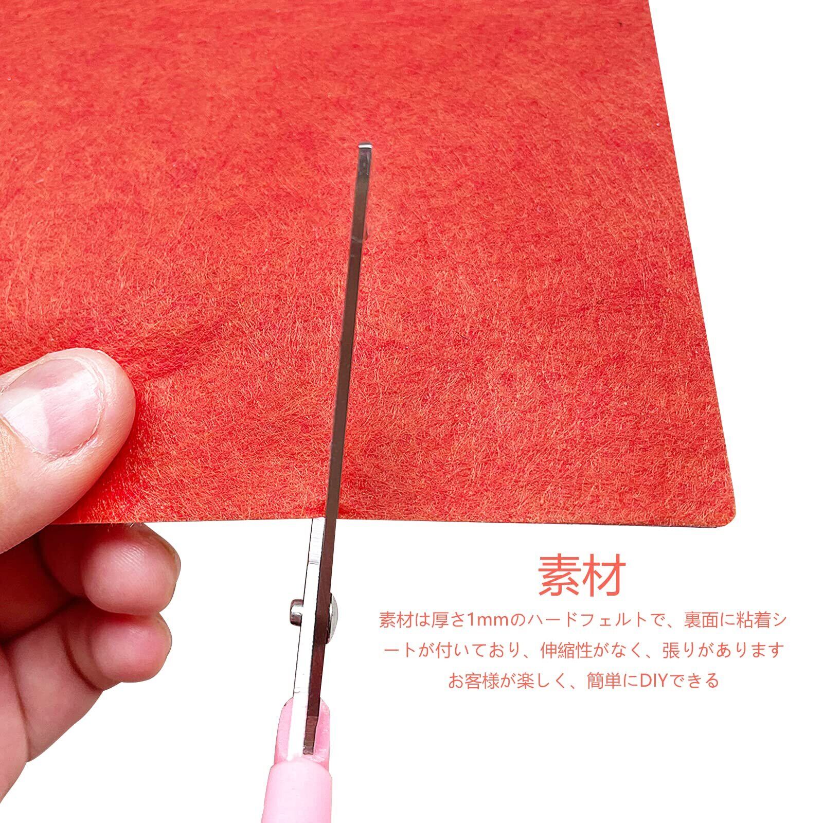 【素材】素材は厚さ1mmのハードフェルトで、裏面に粘着シートが付いており、伸縮性がなく、張りがあります。お客様が楽しく、簡単にDIYできる