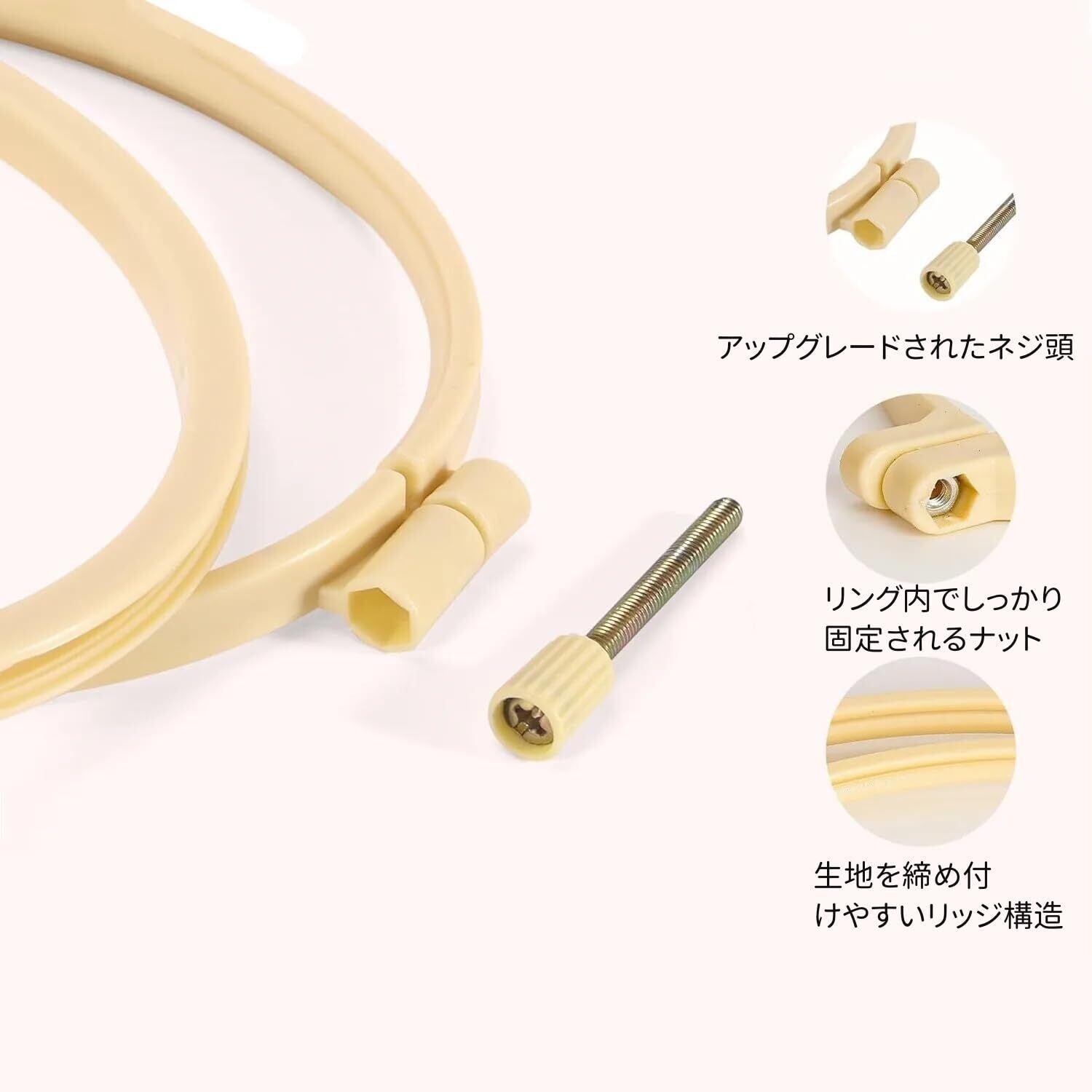 【刺繍枠セット】サイズ:9.5cm、12.5cm、16.5cm、20cm、24cm、27cm。1パックには合計6個が含まれており、それぞれサイズが異なるため、さまざまなシーンや目的に合わせて選択できます。家庭用から作業用まで幅広く対応し、必要に応じて最適なサイズを手軽に利用できる便利なセットです。
