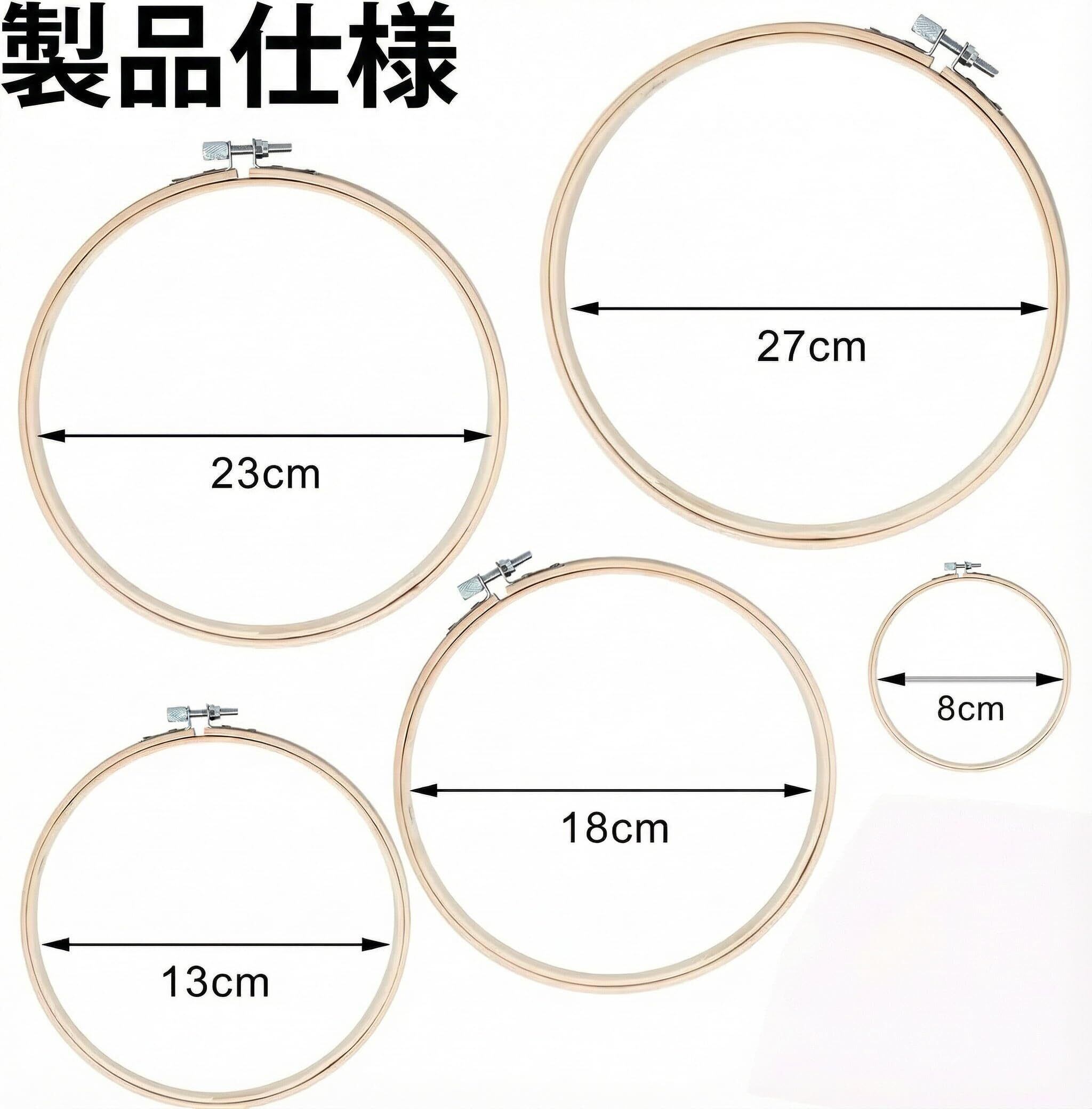 【製品仕様】刺繍リングは5個セットで、それぞれ異なるサイズがあります。内径はそれぞれ:8cm、13cm、18cm、23cm、27cm。材質:天然の竹の材質な。