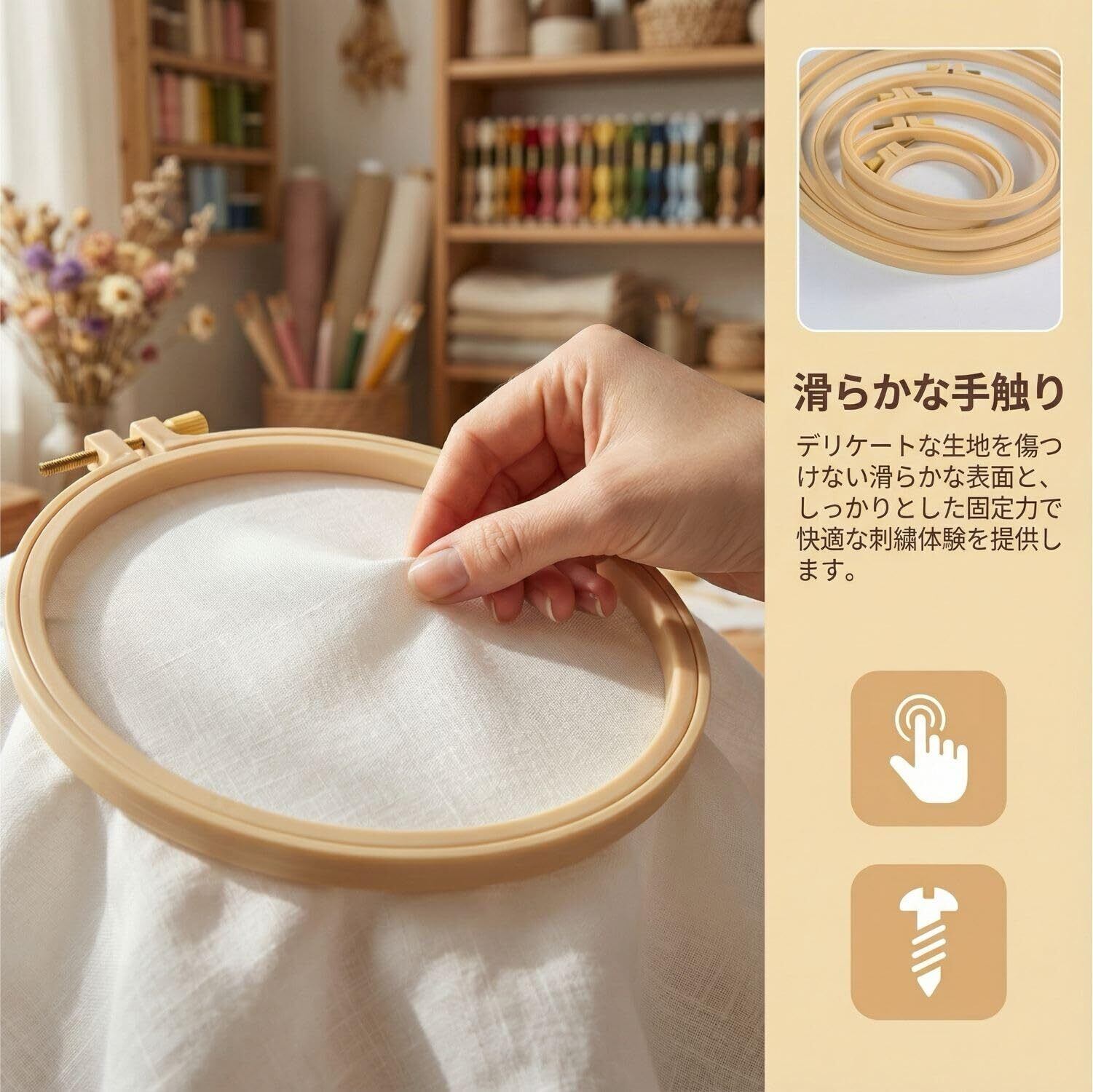 【使い方】刺繍枠のネジを緩めて内枠を外し、布を台にセットしてから、外枠と内枠で布を挟み込み、最後にネジを締めて調整してください。