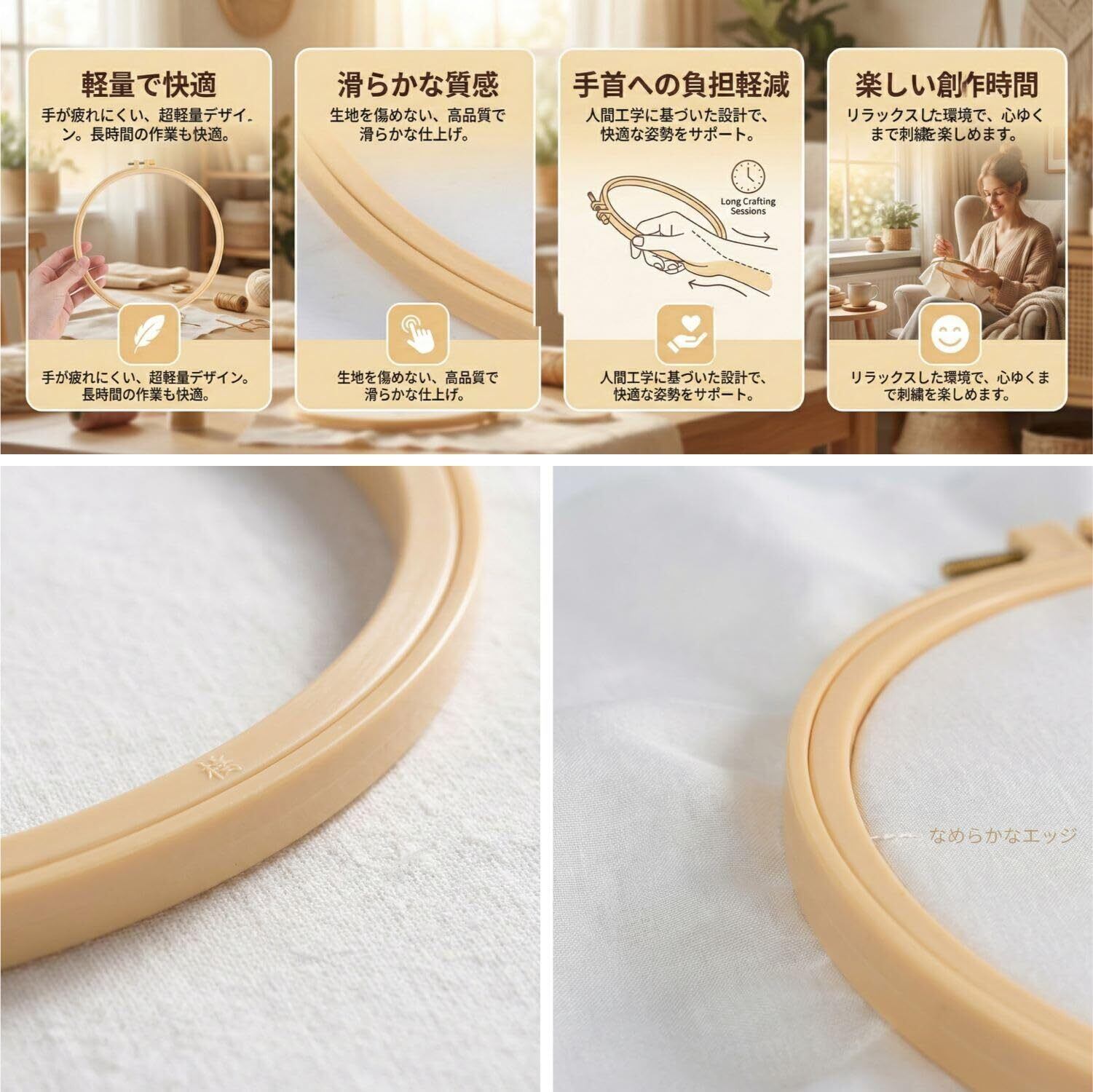 【高品質プラスチック採用】軽量で耐久性があり、色あせしにくい刺繍枠セット。滑らかな表面で、織物を傷つけたりくっついたりする心配がありません。