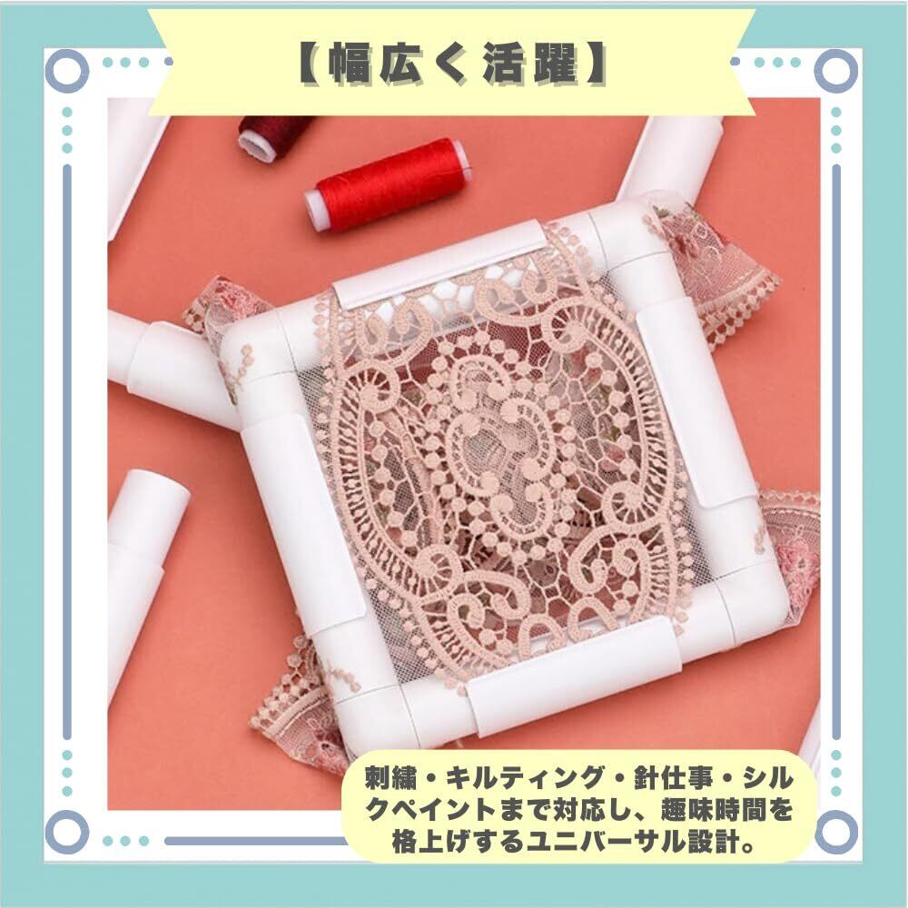 【時短設計】工具いらずでサッと組み立て・分解ができ、使わない時も省スペースでスマートに保管可能な万能フレームです。【作業効率UP】生地を縫い付ける手間なくしっかり固定でき、刺繍やクロスステッチ作業をスムーズに進められます。【安定固定】強力クランプが作品をピンと張った状態でキープし、仕上がりの美しさと作業の快適さを両立します。【幅広く活躍】刺繍・キルティング・針仕事・シルクペイントまで対応し、趣味時間を格上げするユニバーサル設計。