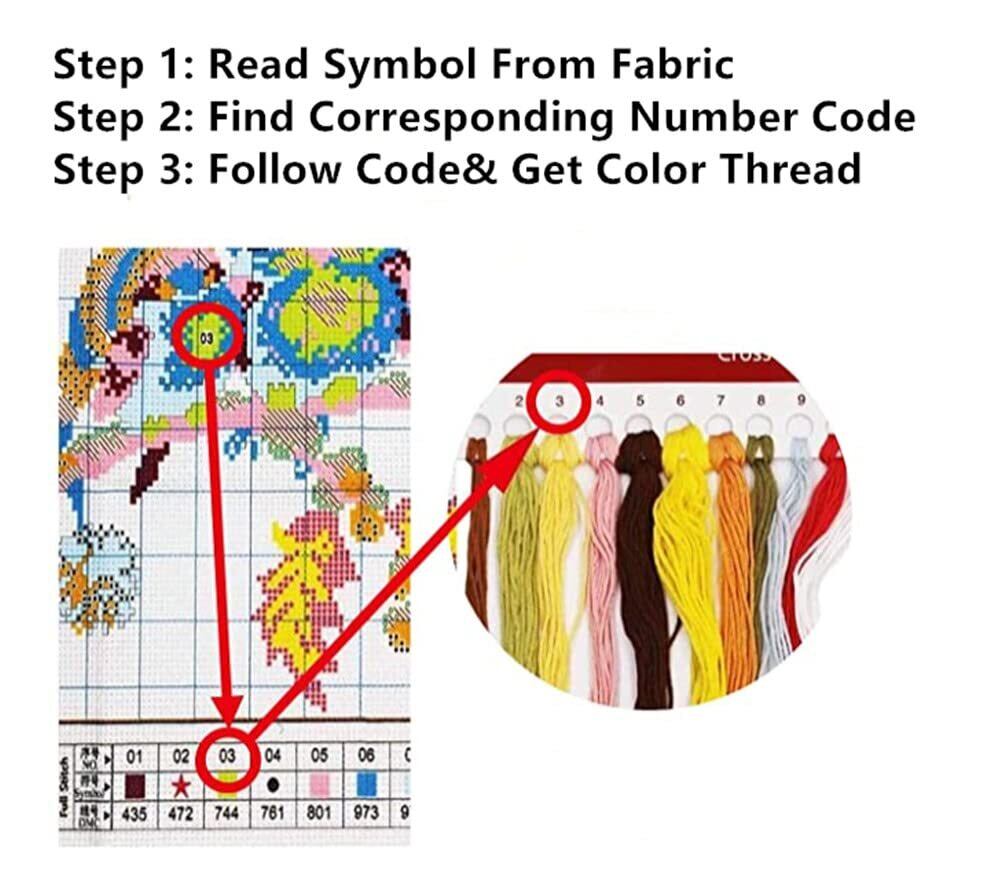 ※プリント柄の色は糸の実際の色とは異なります。 印刷されたパターンの数字または記号を使用して、特定の色に対応する糸を見つけてください。