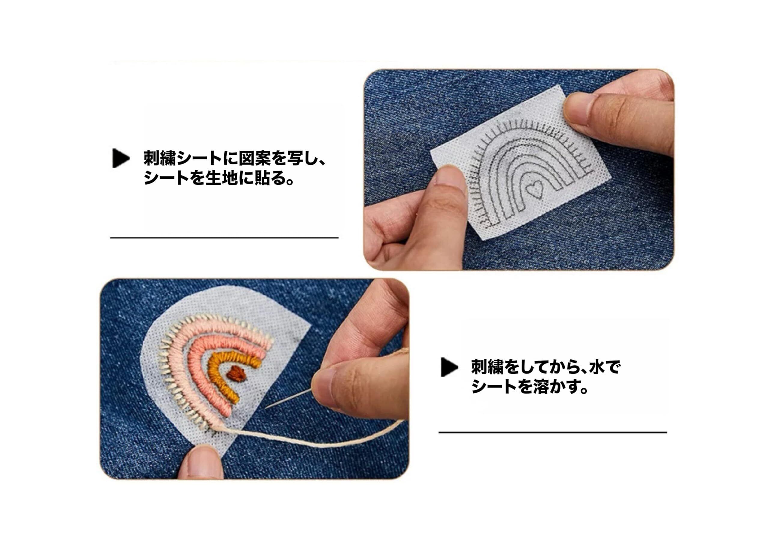 使い方:不織布の面(上側)に図案を描き、不織布を貼ります。刺繍をした後に水で溶かします。