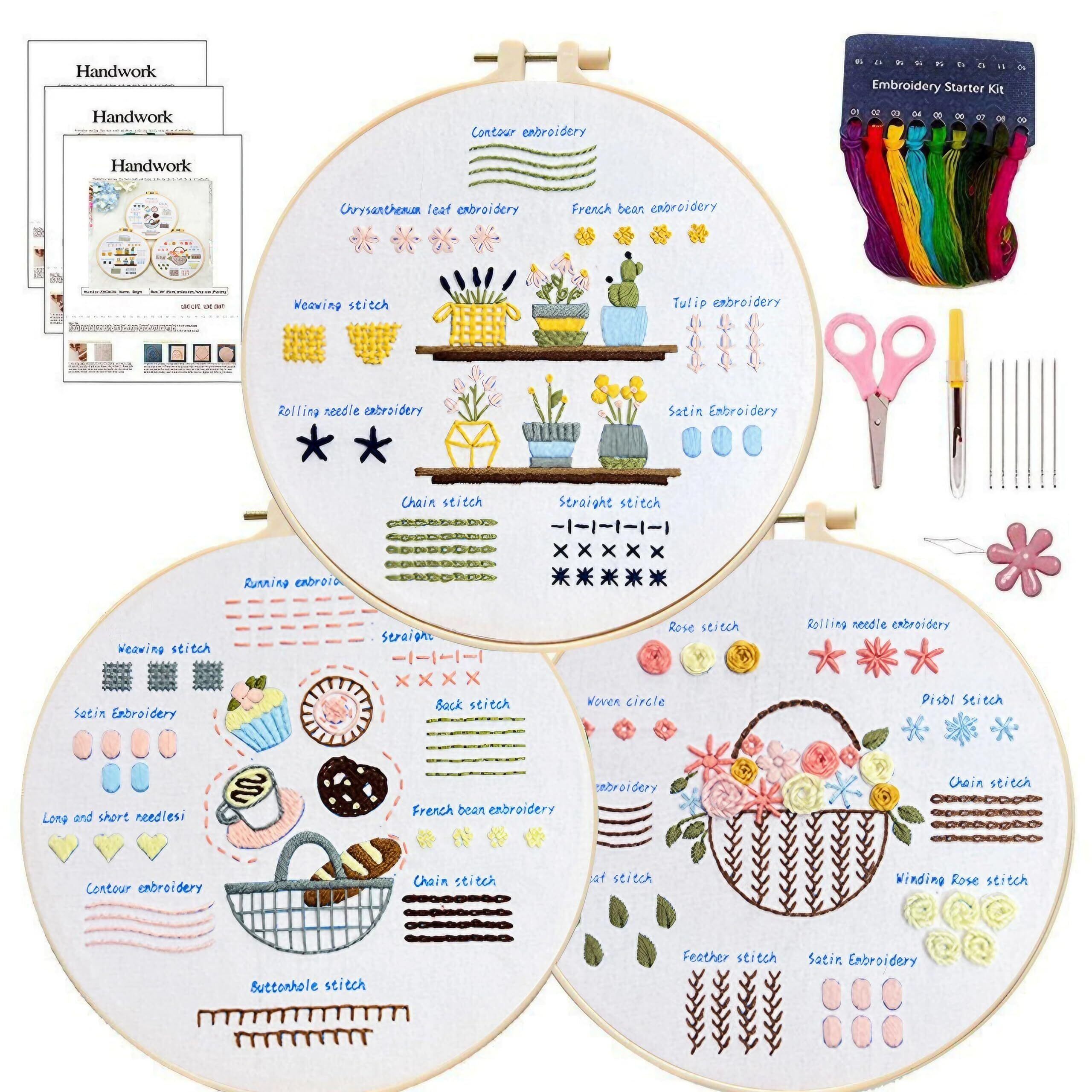 【仕様】サイズ:20cm×20cm、セット内容:①20cm刺繡枠1個、②刺繍布3枚、③刺繍糸3パック、④刺繍針9本、⑤ハサミ、⑥糸通し、⑦シームリッパー、⑧英語/日本語版説明書