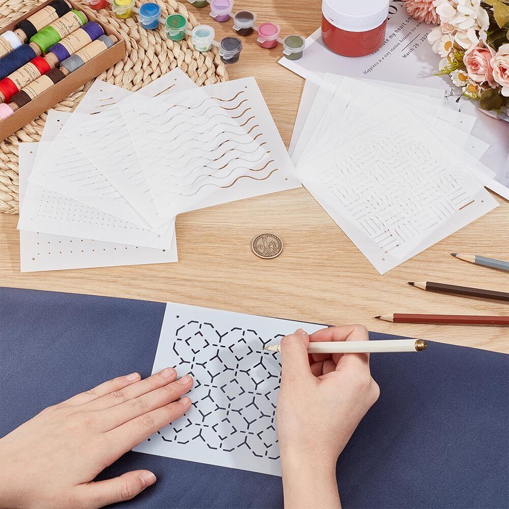 BENECREAT 12枚 刺繍ステンシル 13x13cm 厚さ0.3mm 刺し子ステンシル 点、ライン、ウェーブ、スラッシュなど12スタイル PET 描画線テンプレート 刺し子テンプレート 刺繍ツール ハンドキルティング用