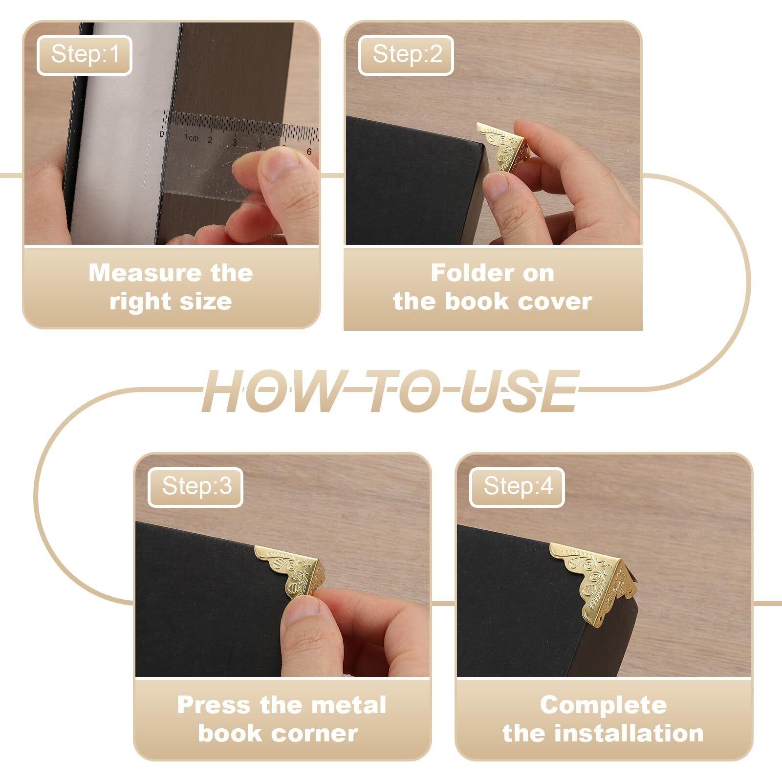 取扱説明: ブックコーナープロテクターは取り付けが簡単で、鉄製のブックコーナープロテクターを優しく開き、本の表紙に挟み、その後、手でまたはプレスで金属製ブックコーナーをしっかりと押します。<br><br>