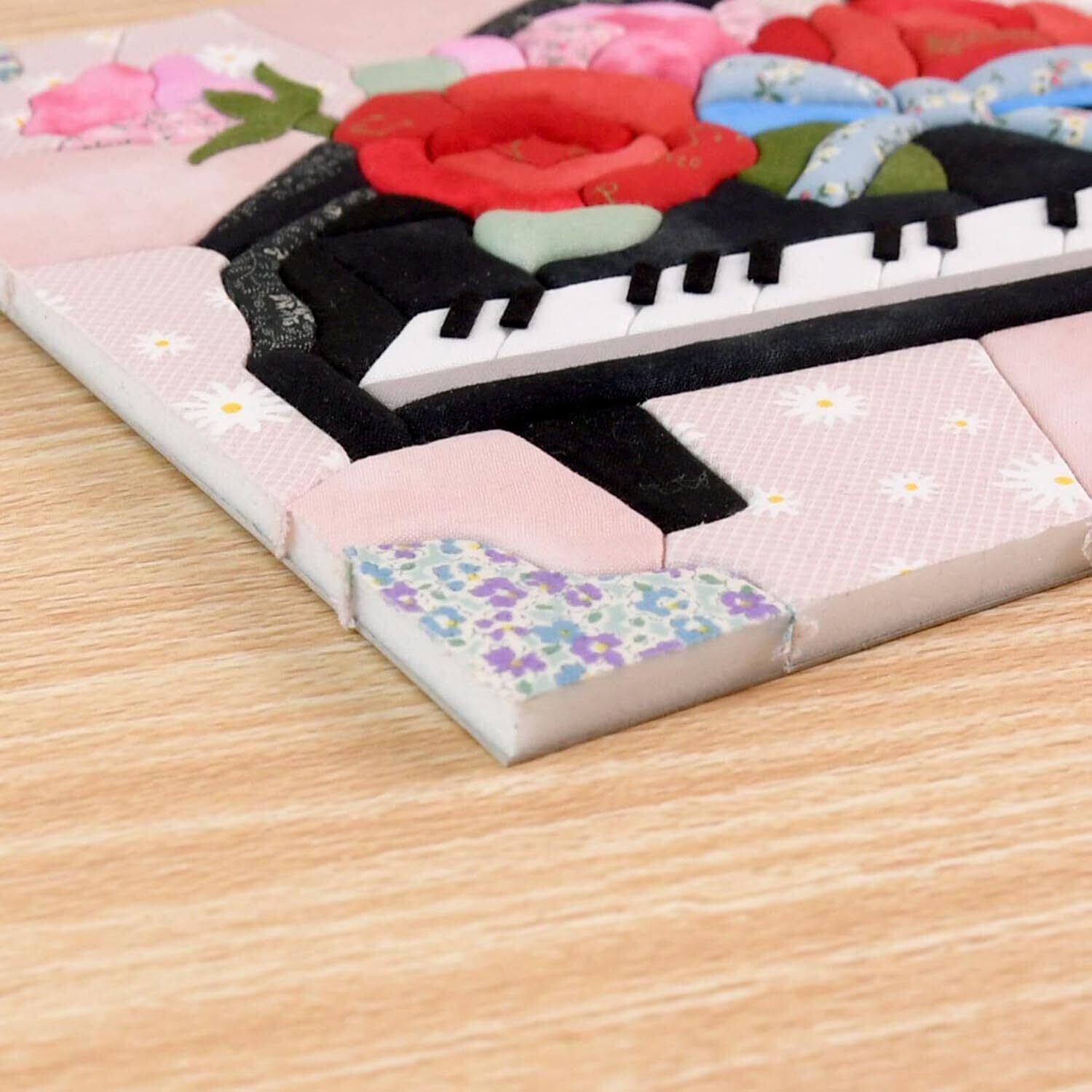 きめこみボードの裏面全体に薄くボンドを塗り、裏板紙に貼りつけます。きめこみボードのミゾを、目打ちですべてなぞります。指定の布に型紙シールを貼り、実線で切ります。型紙シールを布からはがし、指定のきめこみボードに布をきめこんでいきます。指定の場所にはフェルト芯を入れて布をきめこみます。すべてきめこみ終わったらパーツをつけます。