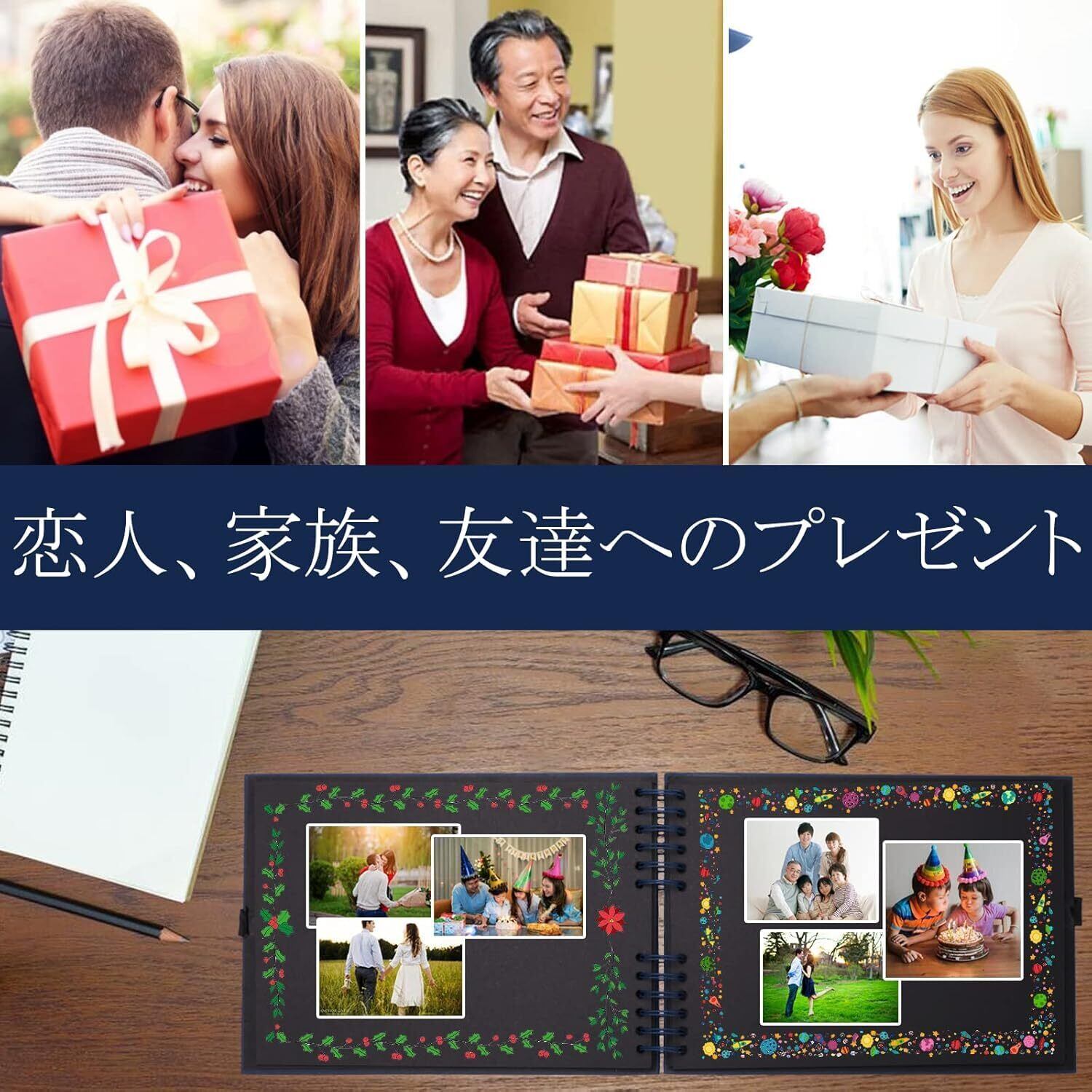 【プレゼントとして】このスクラップブックはお好みに合わせて自由に飾り付けができますので、自分用はもちろん、プレゼントとしても適用です。誕生日、結婚式、記念日、母の日、入学式、バレンタインデー、クリスマス、送別会などで特別なプレゼントとして贈るのにもいいと思います。