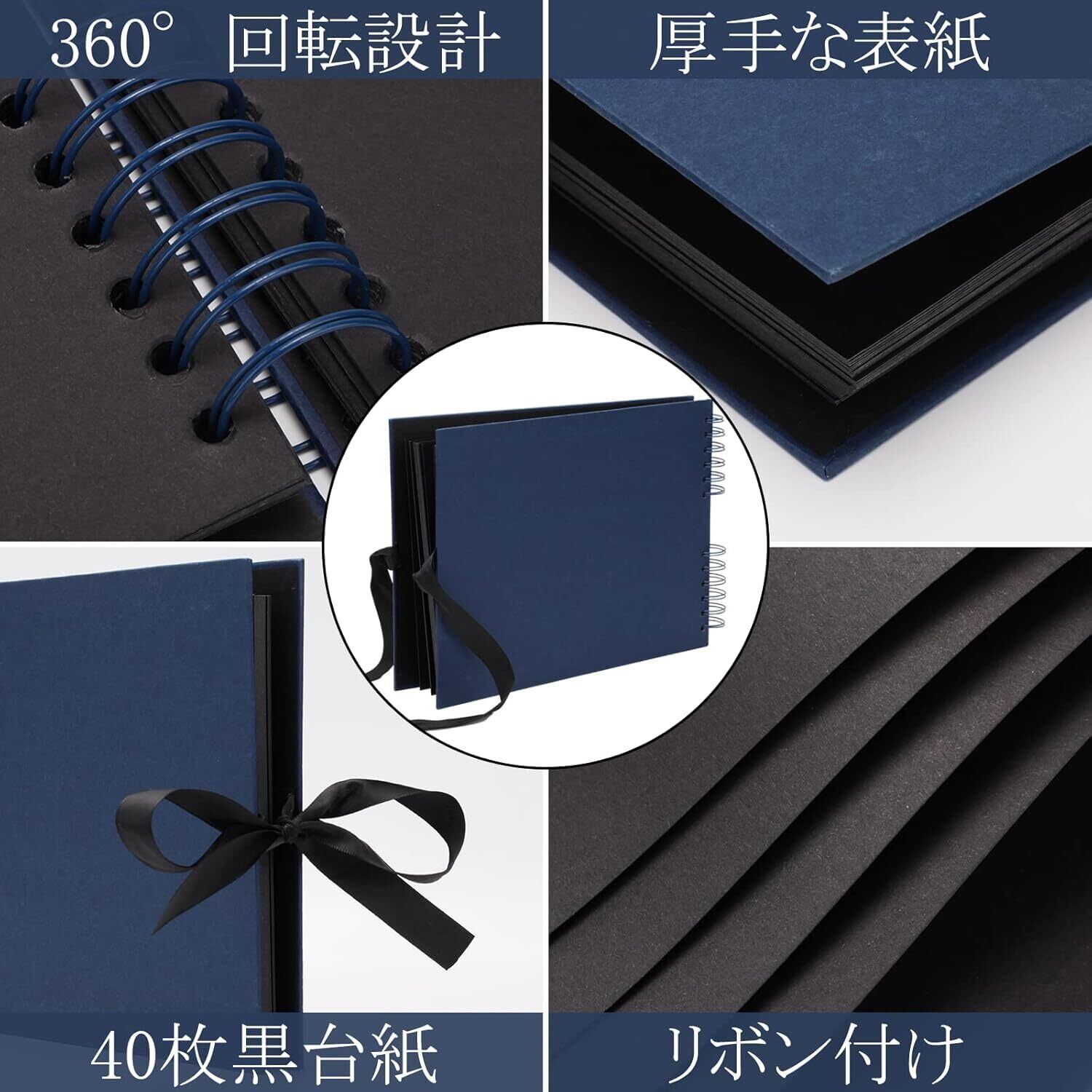 【高質量なアルバム】エレガントなリボンを付けてかわいい手作りアルバムです。厚みのある表紙なので重厚感があり、高級感のある黒の台紙は40枚あるのでたくさんの写真を収納できます。太いダブルリングが、大胆かつ華やかな印象を与えます。台紙の移動もできますし、素材の量に合わせて自由に増減することができます。