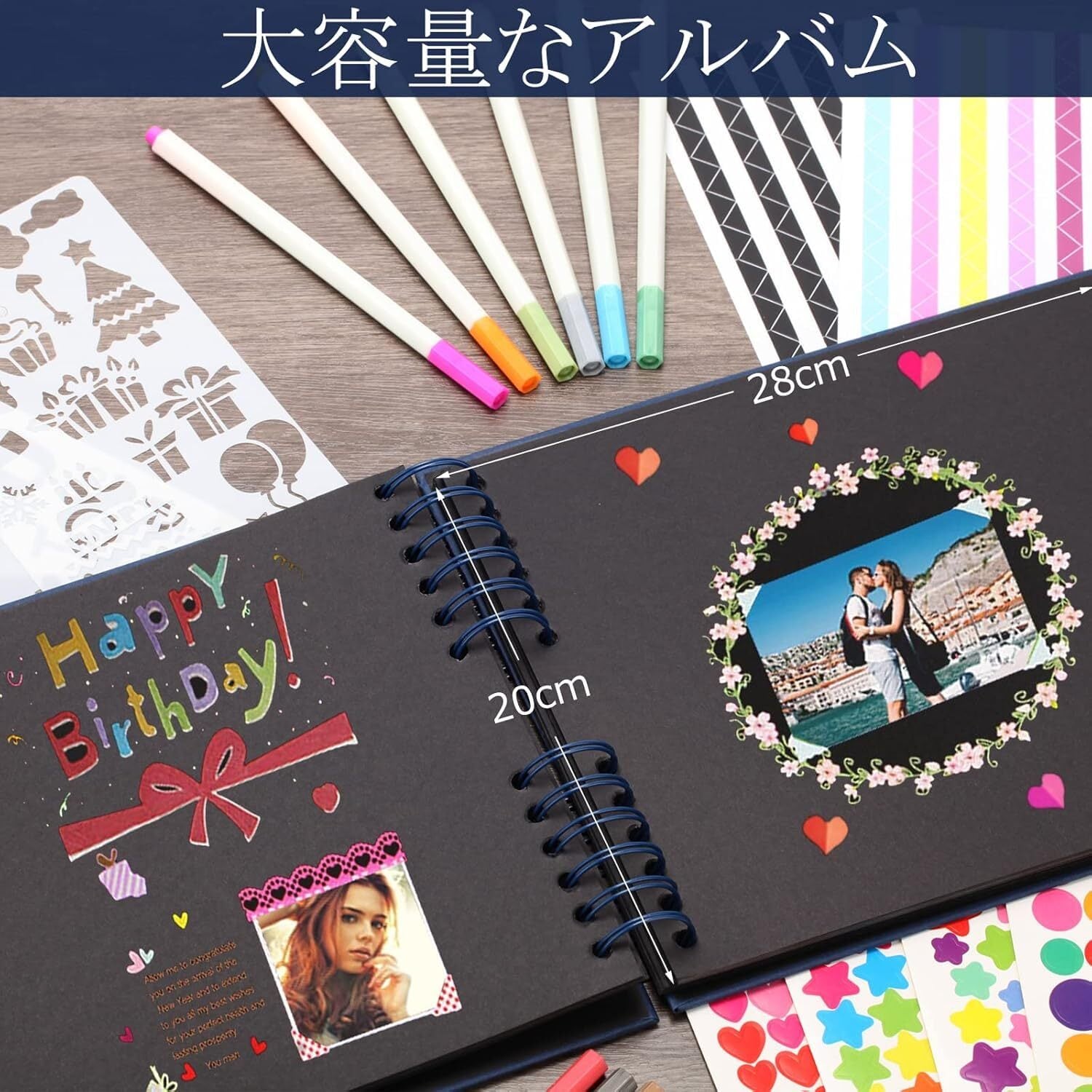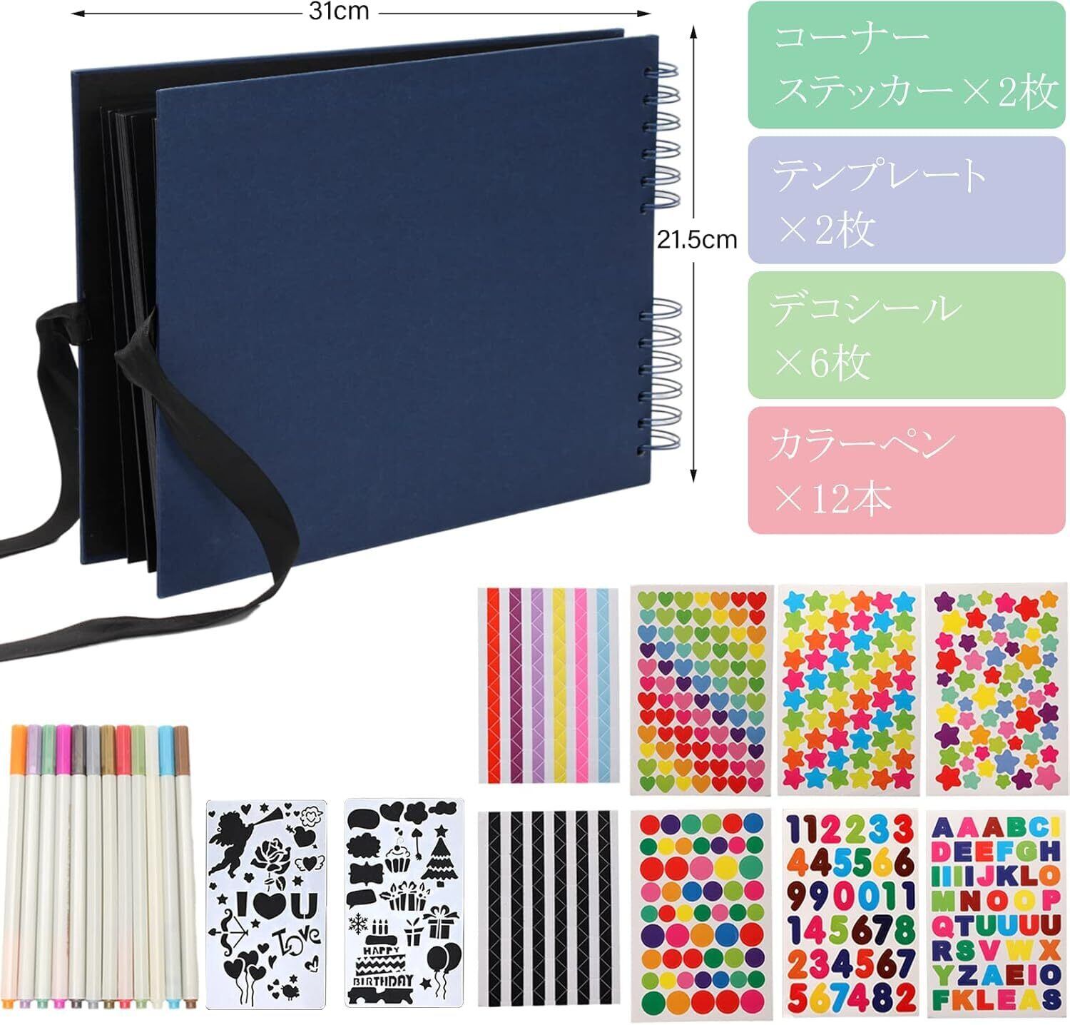 【商品仕様】アルバムサイズ:31*21.5*2.5CM 台紙サイズ:28*20CM(40枚/80ページ)梱包内容:アルバム×1冊、カラーペン×12本、コーナーステッカー×2枚、デコシール×6枚、テンプレート×2枚