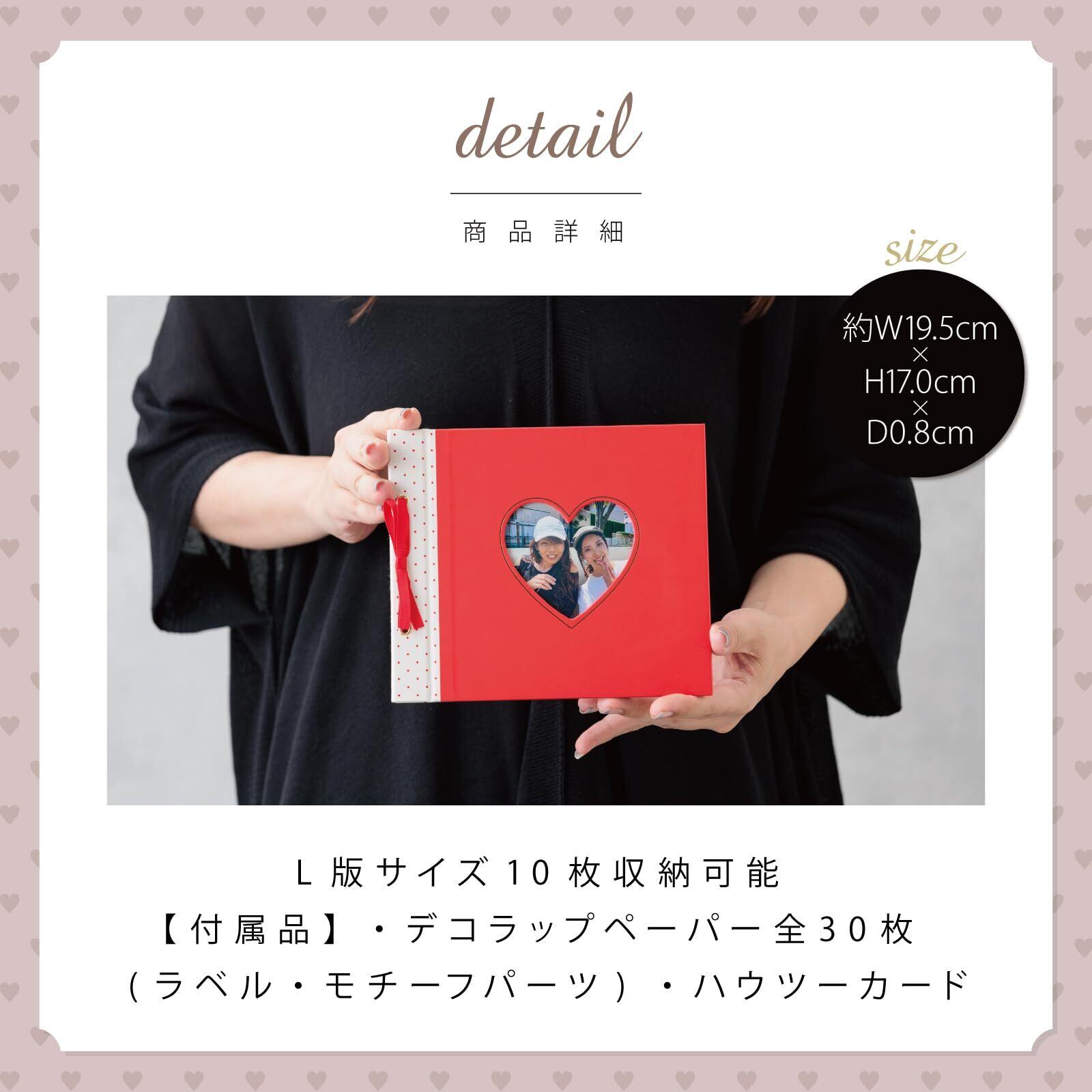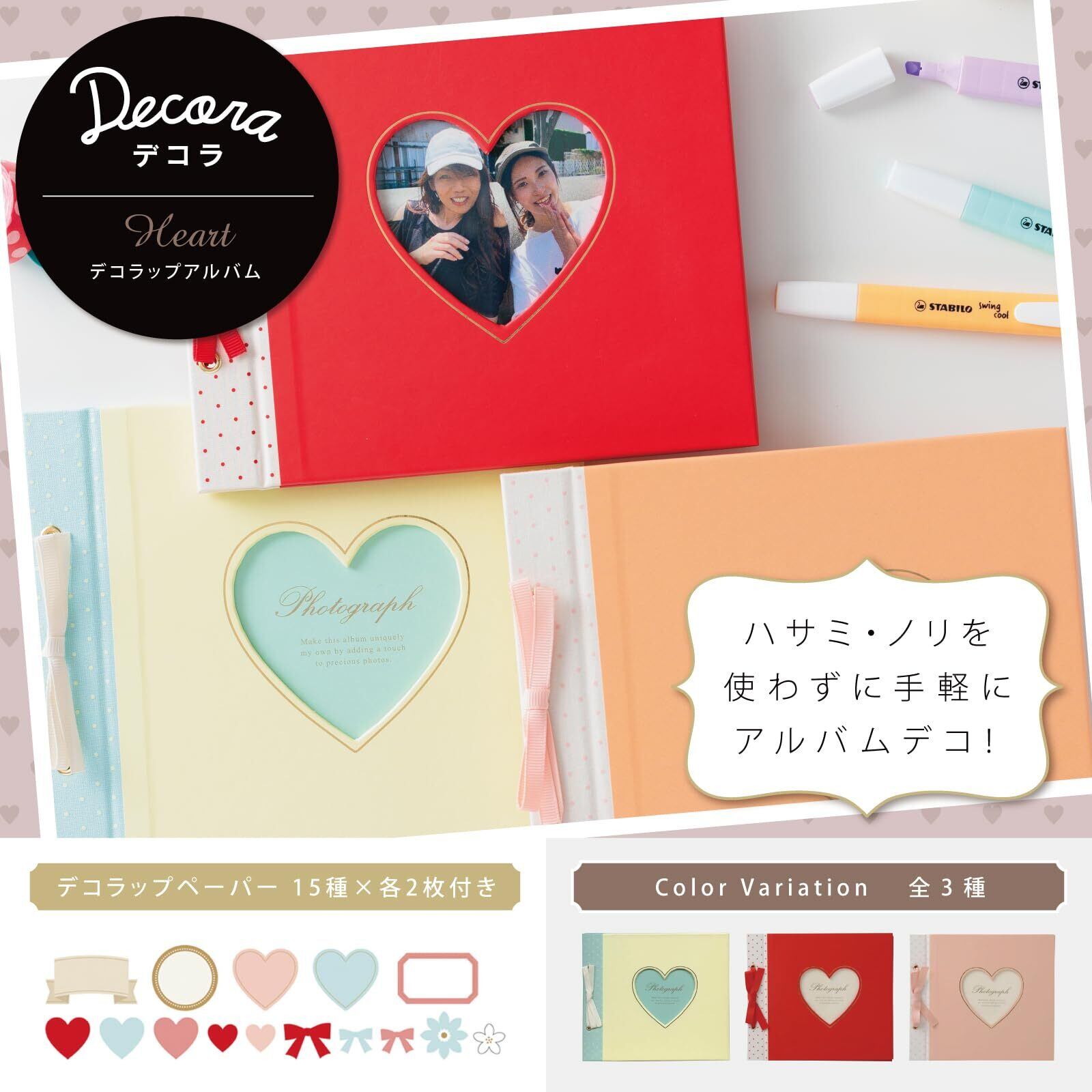 【簡単フォトデコレーション!】はさみものりも使わずに、写真を貼って手軽にアルバムデコ! アルバムをもっと楽しく、スクラップよりも手軽にしたい! そんな思いから生まれた「デコラップ」。キュートなハートデザイン。