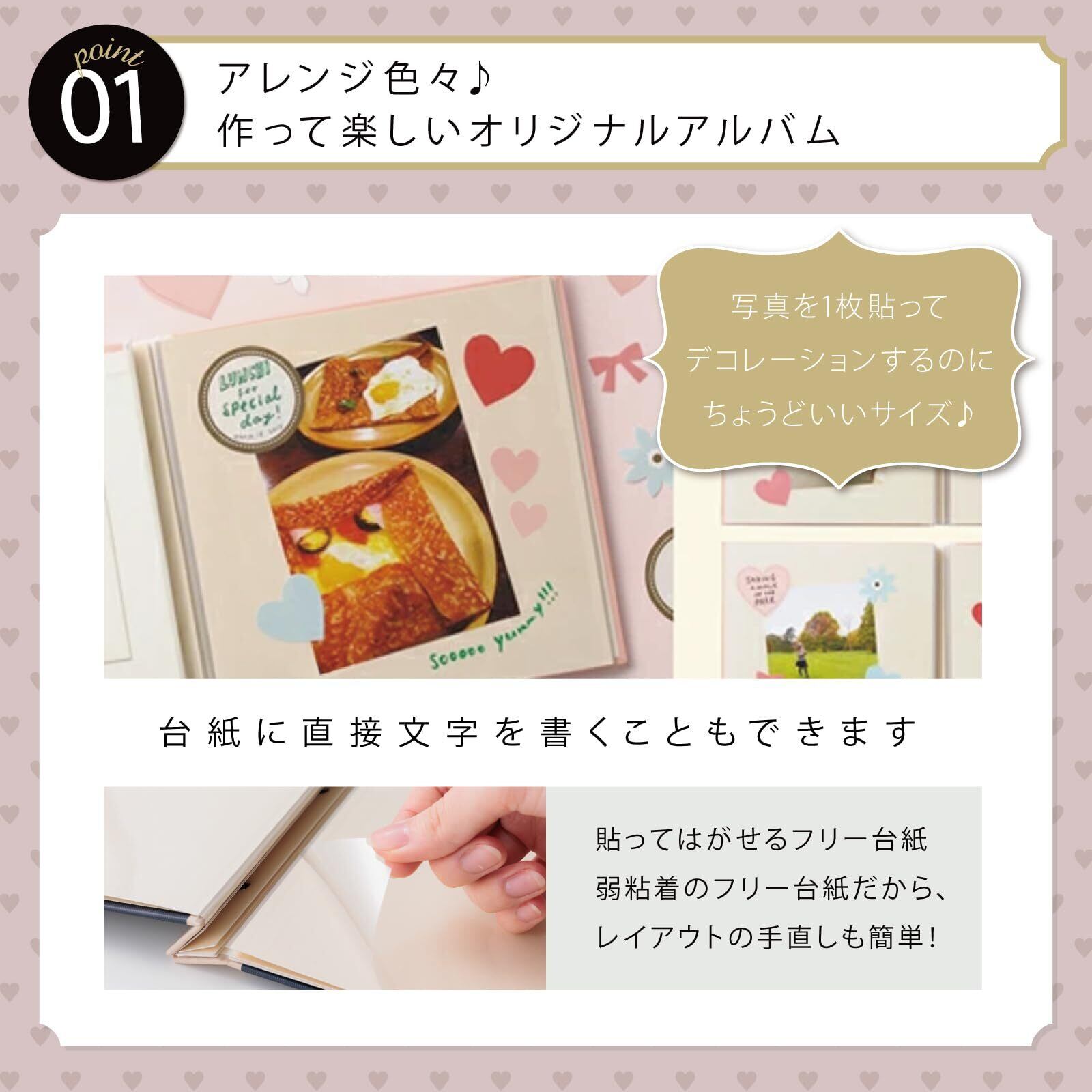【アレンジ色々】弱粘着のフリー台紙なので貼り直しやレイアウトの手直しも簡単。 台紙に直接文字を書いたり、付属のモチーフペーパーでデコレーションもOK。 ひも綴じだから作業もラクラク!別売りのリフィルでページを追加できます。