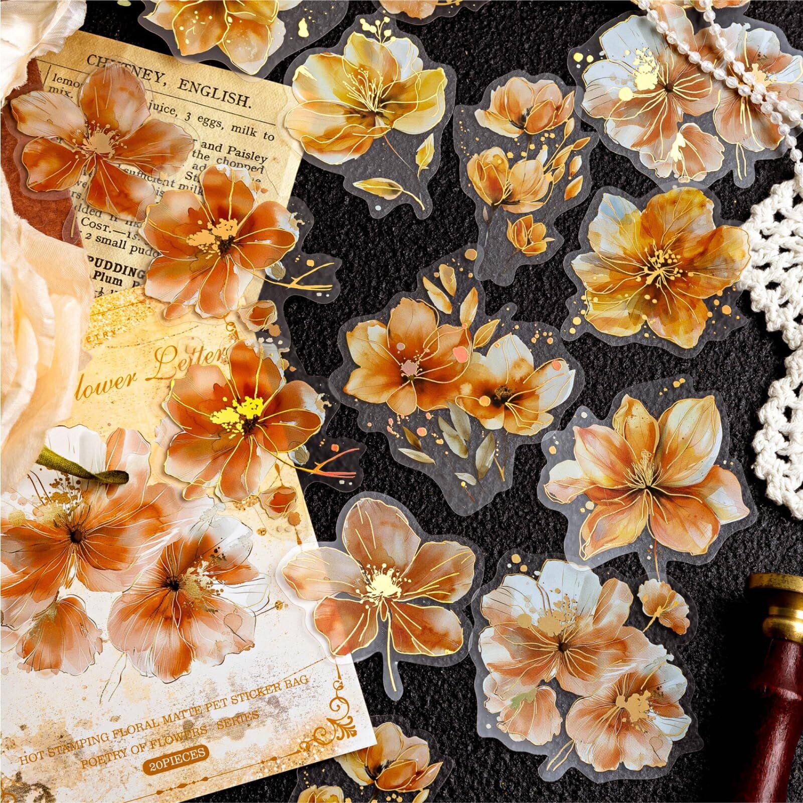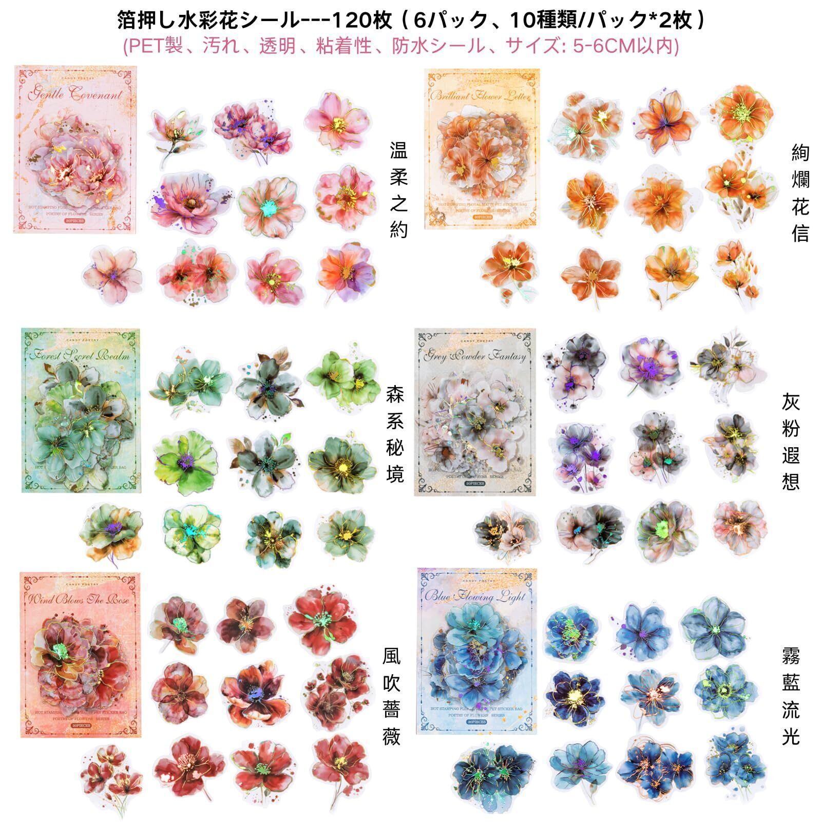 花 フレークシール 大容量 120枚 6色セット箔押し水彩花 コラージュ 素材 シールPET華やかフラワー手帳デコ 日記 icカード 収納ケース 水筒 ノートパソコン カードのデコ ステッカー