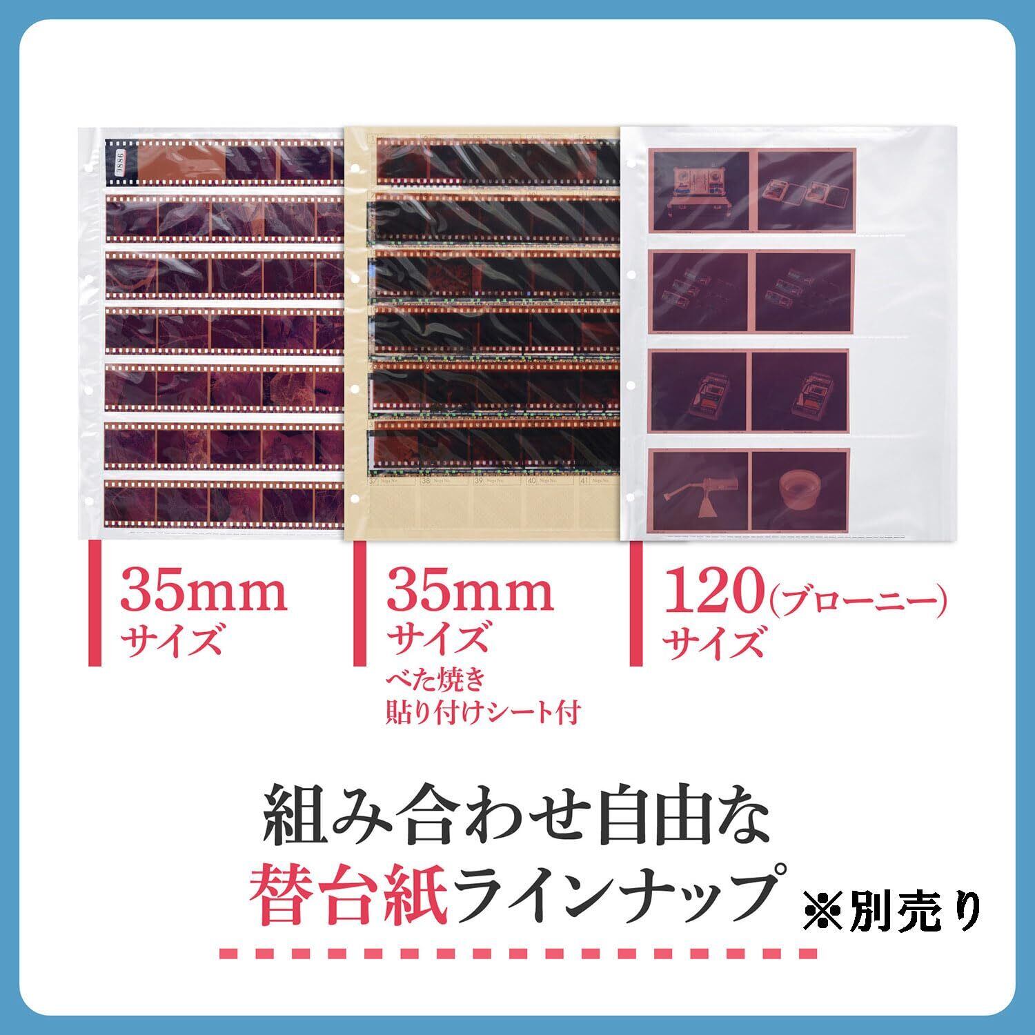 ■仕様:4穴バインダー式アルバム、■対象フィルムサイズ:35mm(135)サイズ、■外寸法:約W270×H315×D26mm、■収納コマ数:1シートあたり35mmサイズ 42コマ収納可能、■シート数:30シート、■材質:紙・PP