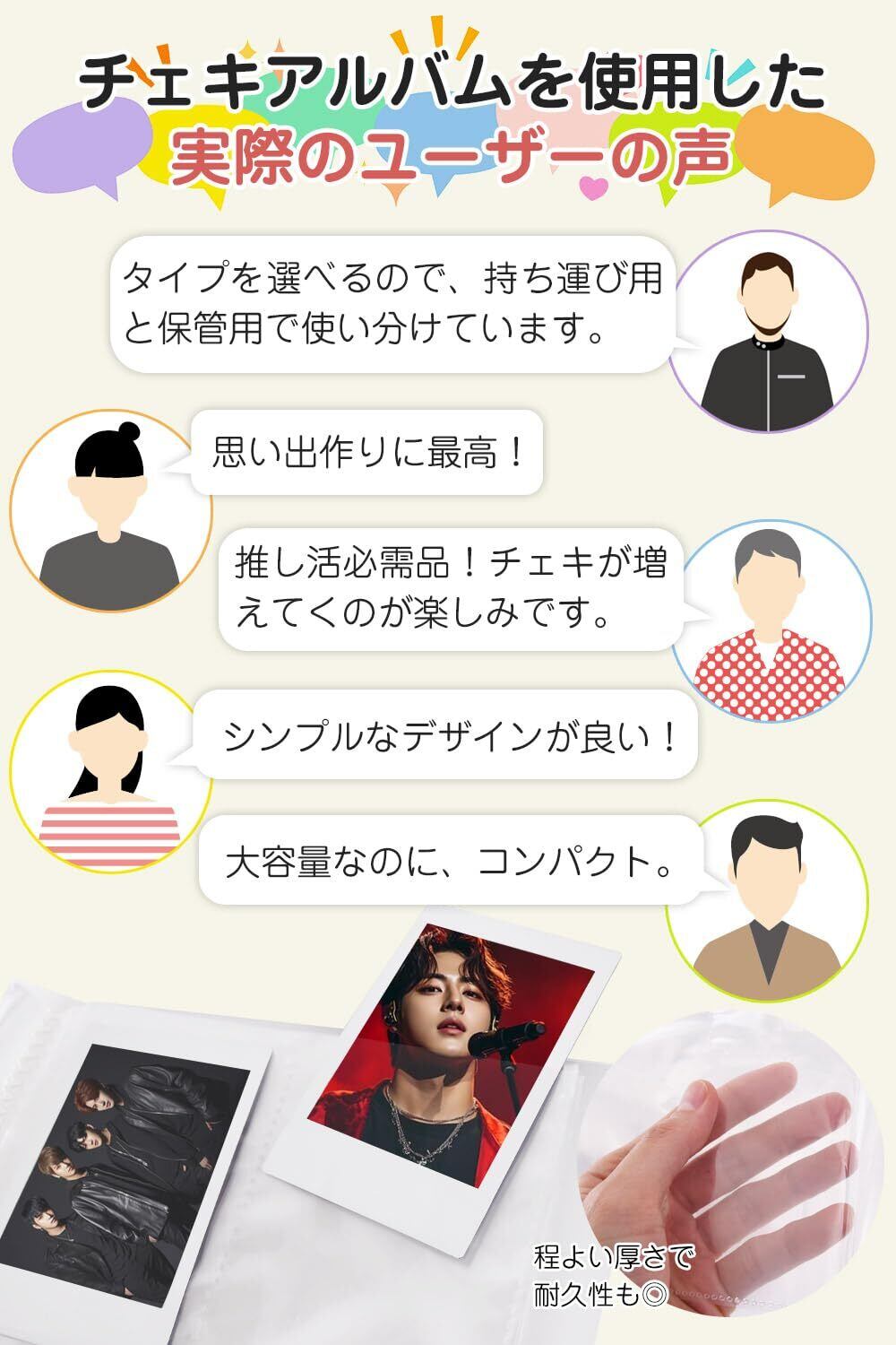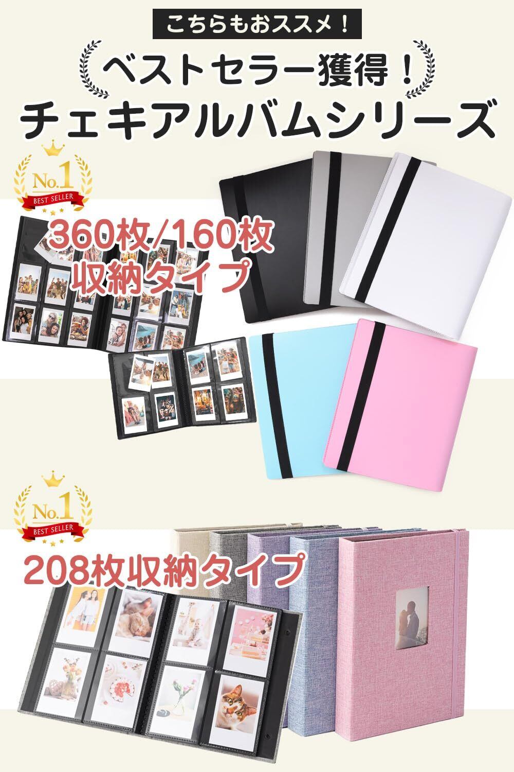 ホコリや汚れから保護してくれるため大切な思い出のチェキを入れるのにぴったりのチェキ用アルバム。