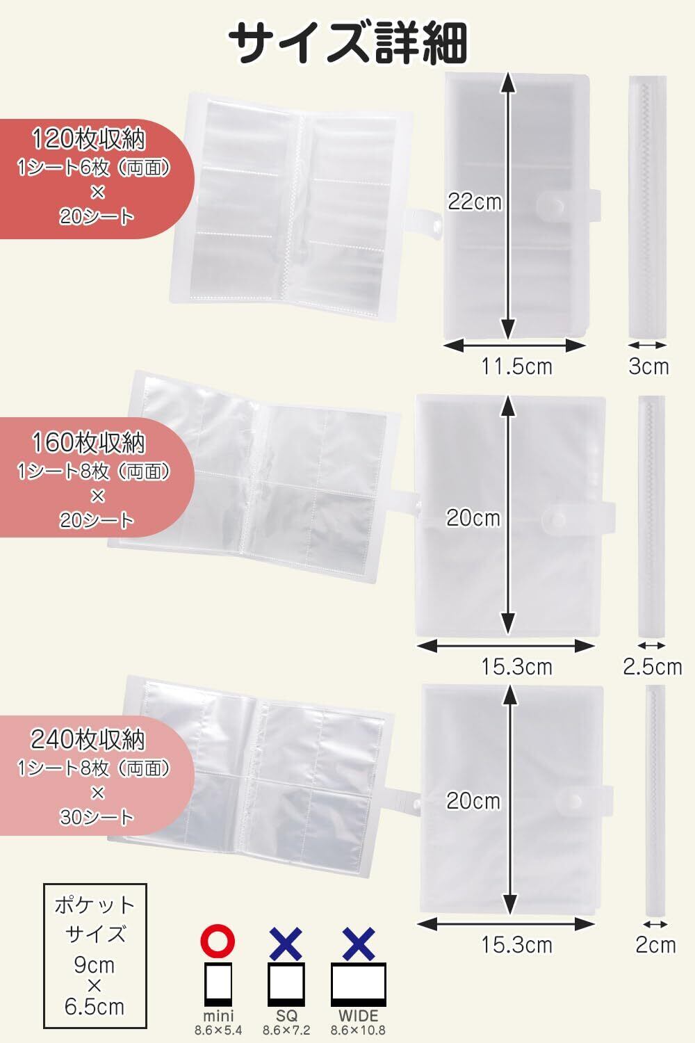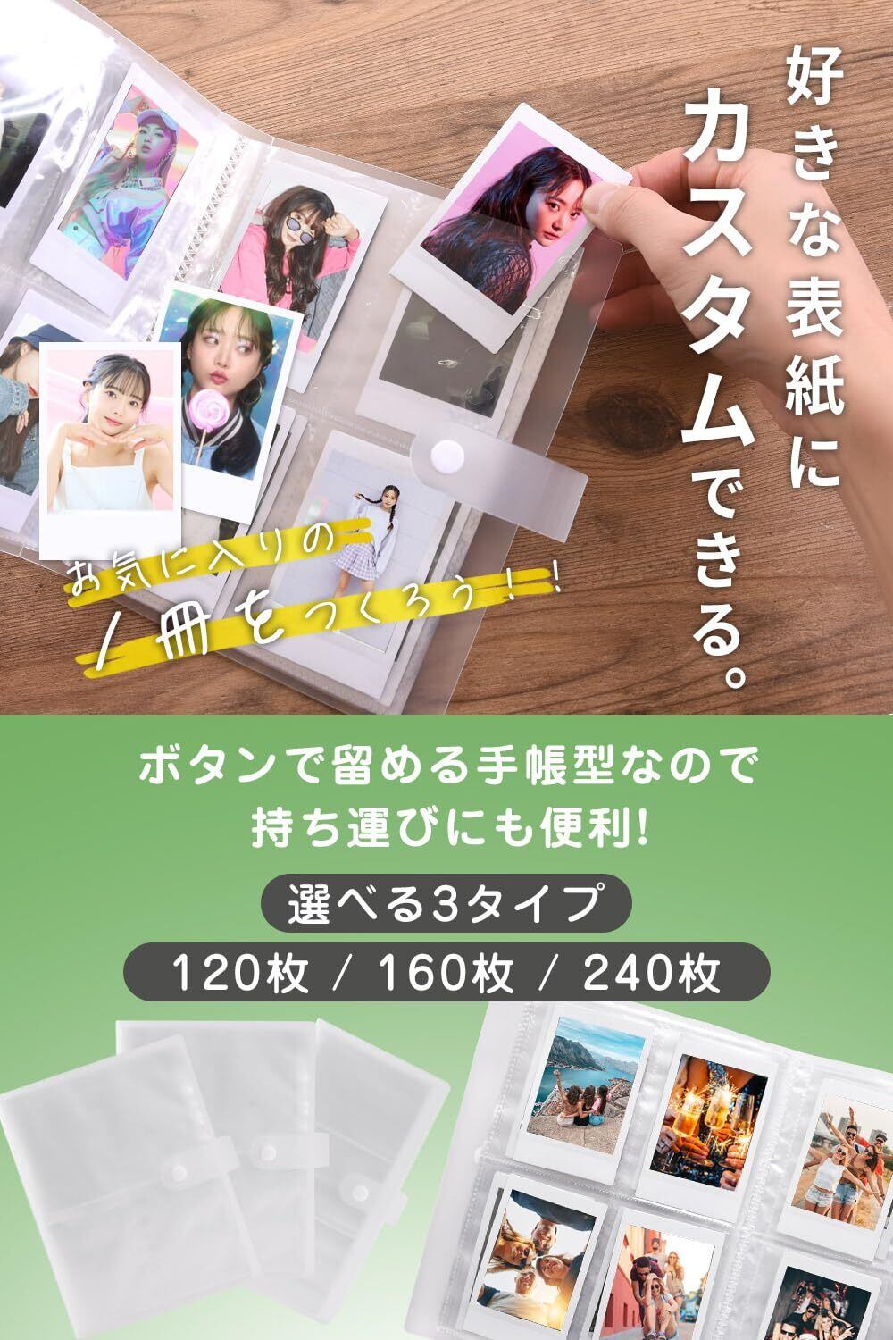 留めるボタン付きで手帳のように持ち歩けるチェキ用アルバムを3タイプ(120枚/160枚/240枚)でご用意しております。