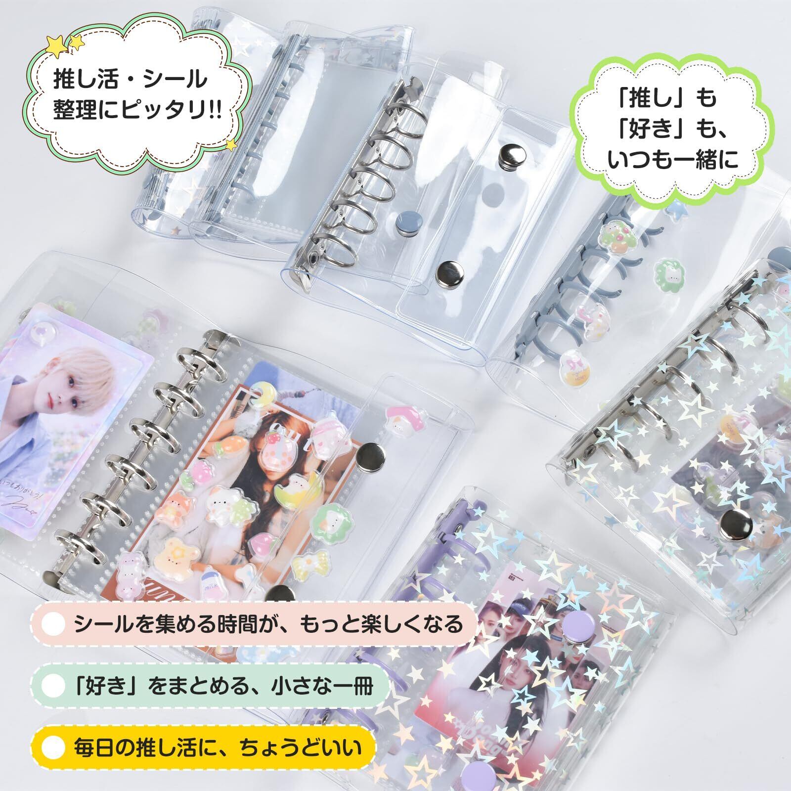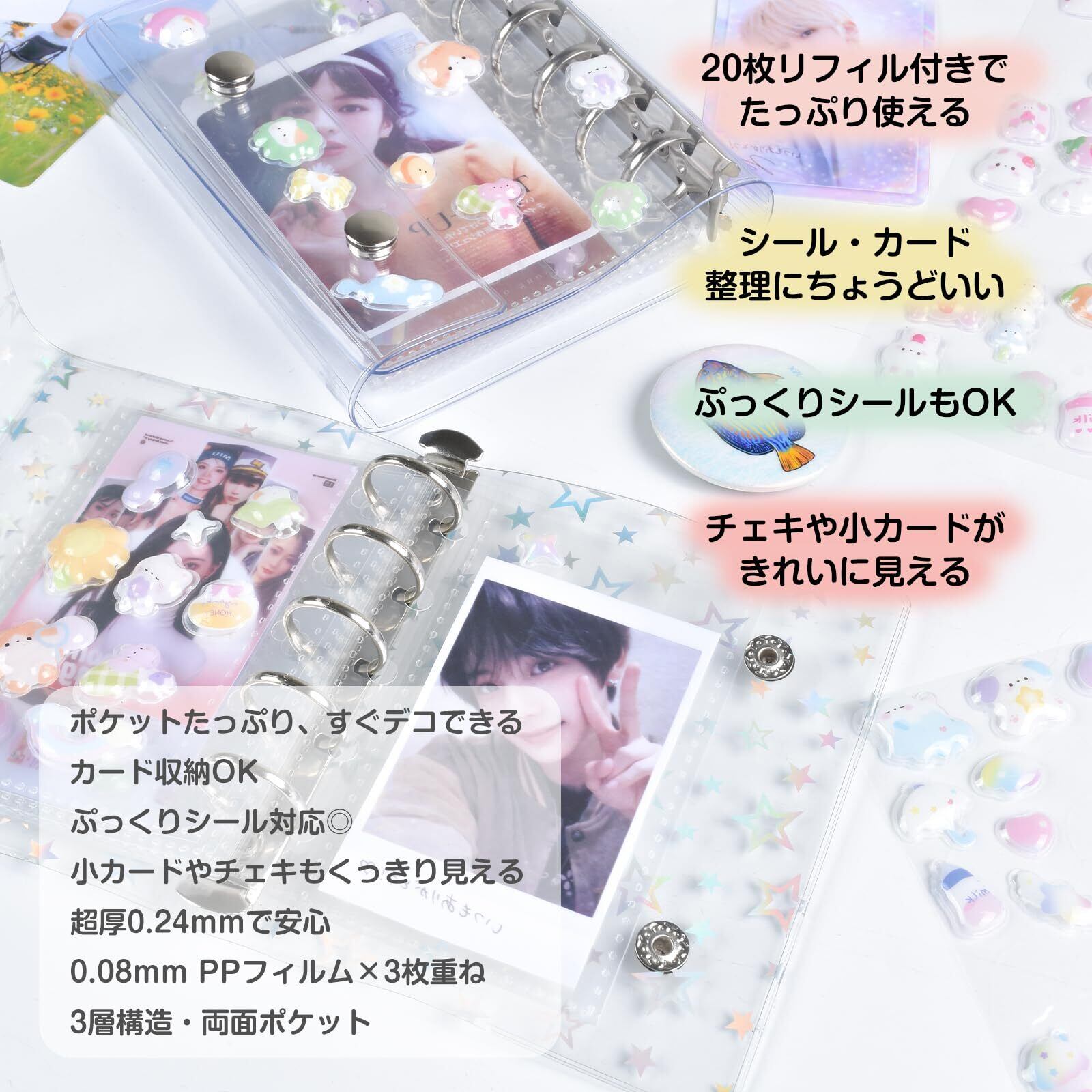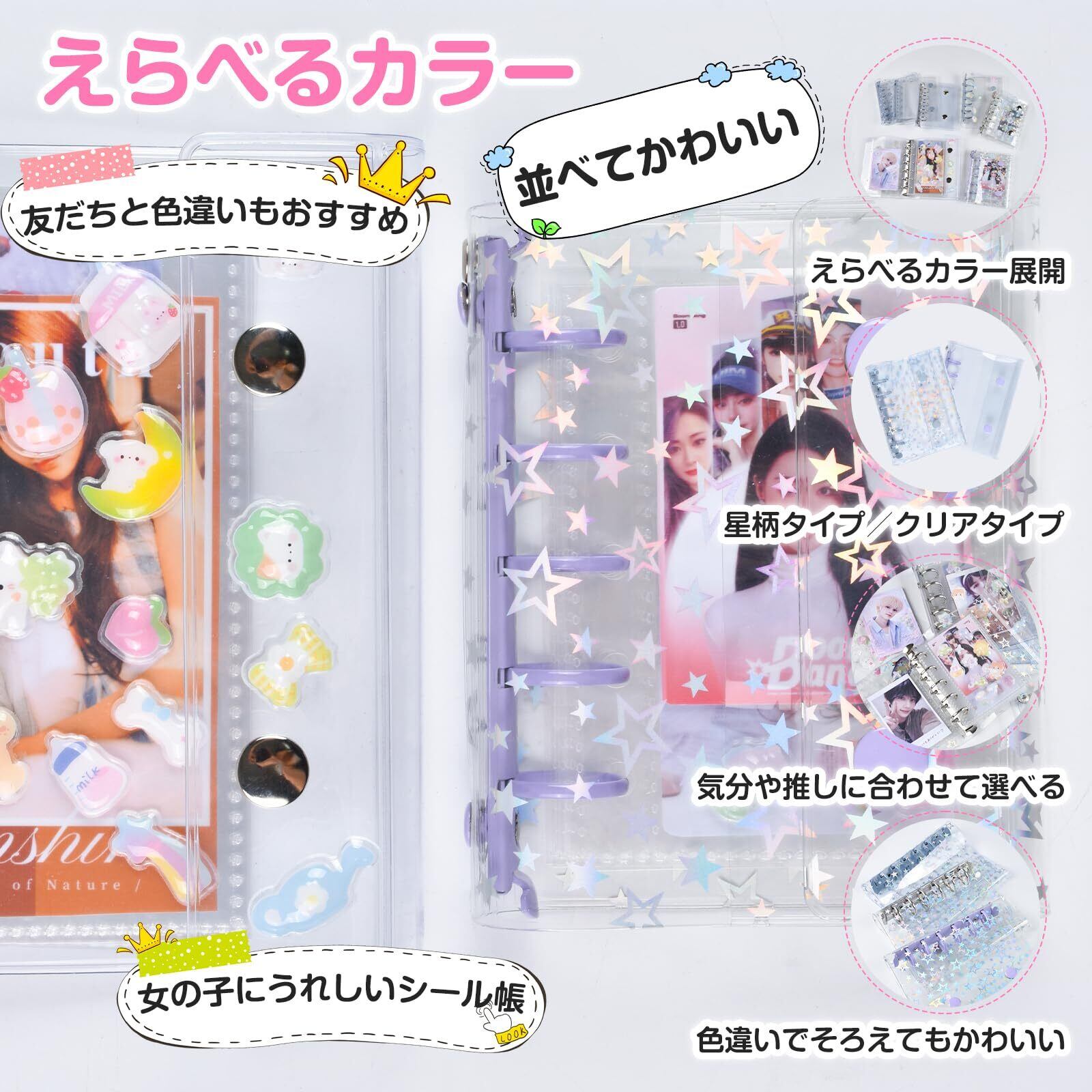 【透明だから“好き”が映える・星柄&クリアタイプから選べる】 高透明のカバーで、中に入れた 推し小カード や チェキ、シールデコ が映えて見えるのが魅力。シンプルに使いやすい クリアタイプ と、かわいさをプラスできる 星柄タイプ の2デザインがあり、気分や推しカラーに合わせて選べます。透明素材なので中身が見やすい反面、見せたくないものの保管にはやや不向きですが、 女の子 にうれしい“見せる収納”を楽しみたい方には相性のいい かわいいシール帳 です。