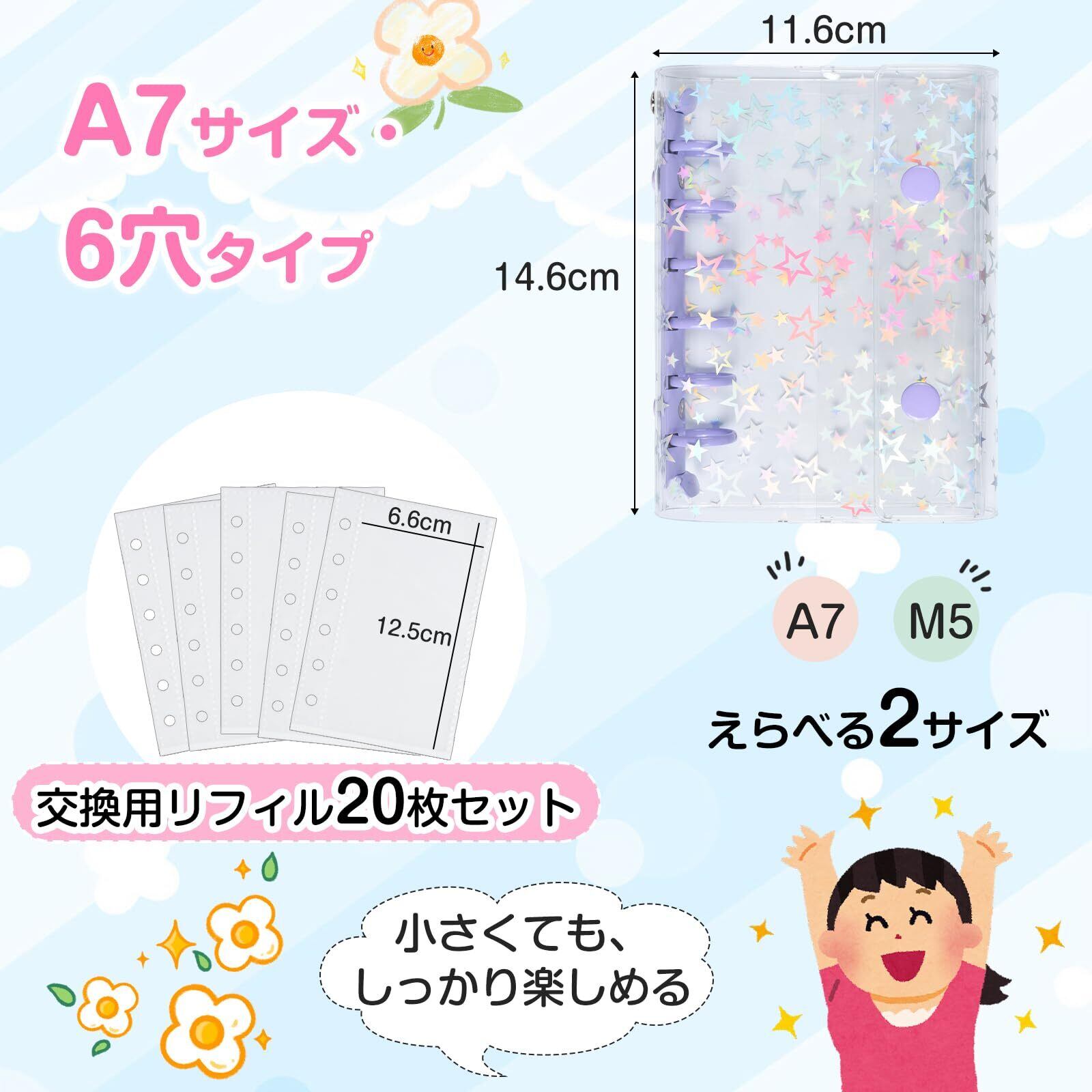 【えらべる2サイズ・6穴タイプで使いやすい】 コンパクトで持ち歩きしやすい A7 と、さらに小さくまとまる M5 の2サイズをご用意。どちらも使いやすい 6穴バインダー 仕様で、リフィル20枚付きだから届いてすぐ使えます。 シール帳 や シールバインダー としてはもちろん、 チェキ や小カード整理にもぴったり。ミニサイズなので大きめカードの収納には向きませんが、そのぶん毎日の 推し活 にちょうどいいサイズ感です。