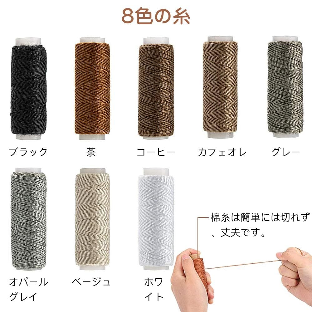 8色の糸:綿糸*8(ブラック、茶、コーヒー、カフェオレ、グレー、オパールグレイ、ベージュ、ホワイト)丈夫で切れにくく、スムーズな縫い心地。