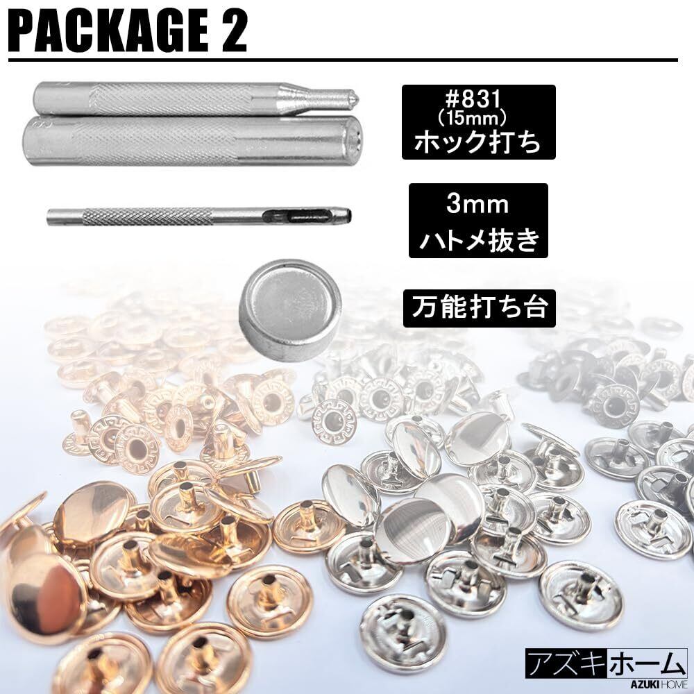 バネホック3色60組 打ち具付き スナップ ボタン ハトメ打ち棒 DIY手作り レザークラフト 万能打ち台 取扱説明書付き NO.831 15mm