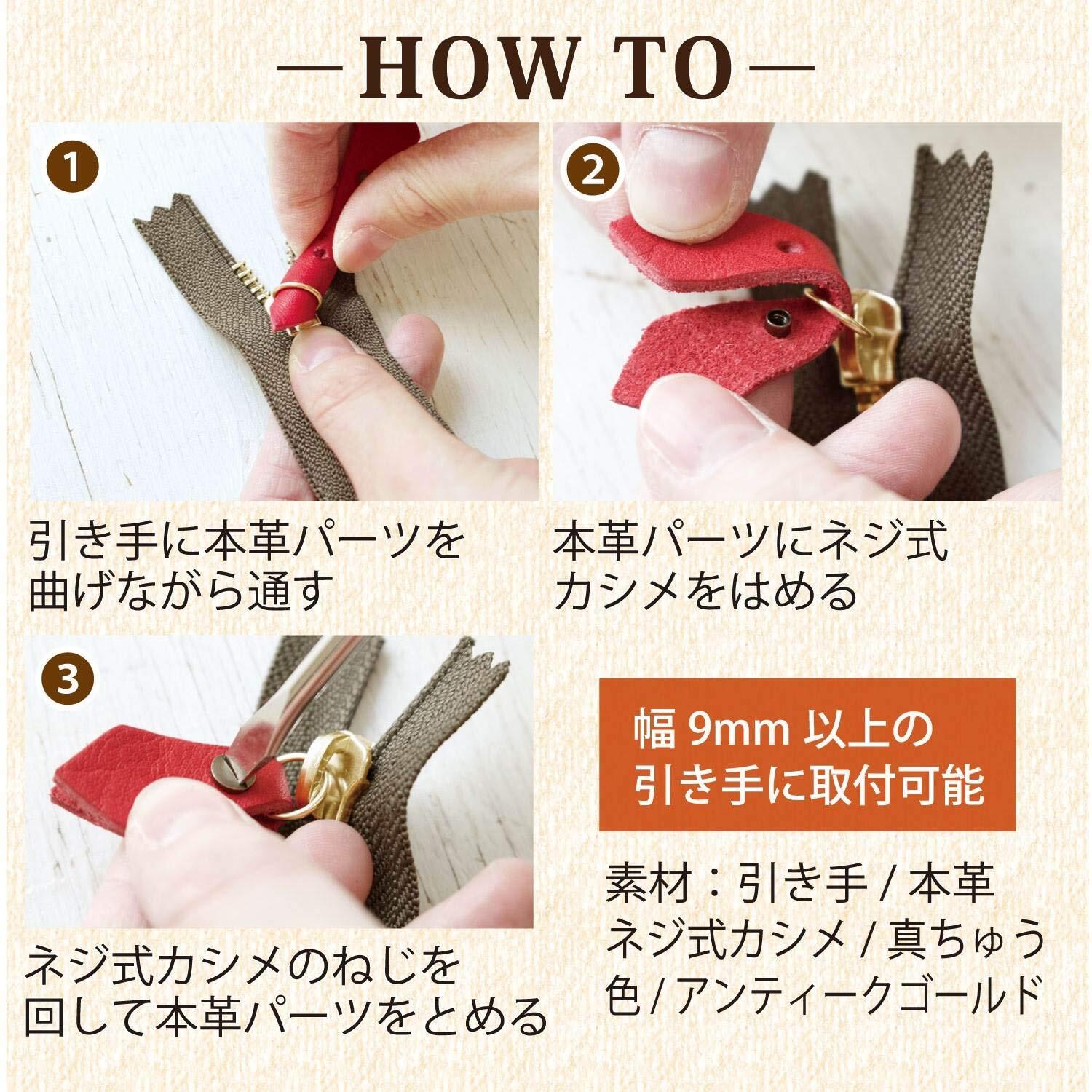 簡単に取り付けられる本革のファスナーパーツ。 持っているポーチや財布の引手のアレンジや、お直しにもおすすめ!