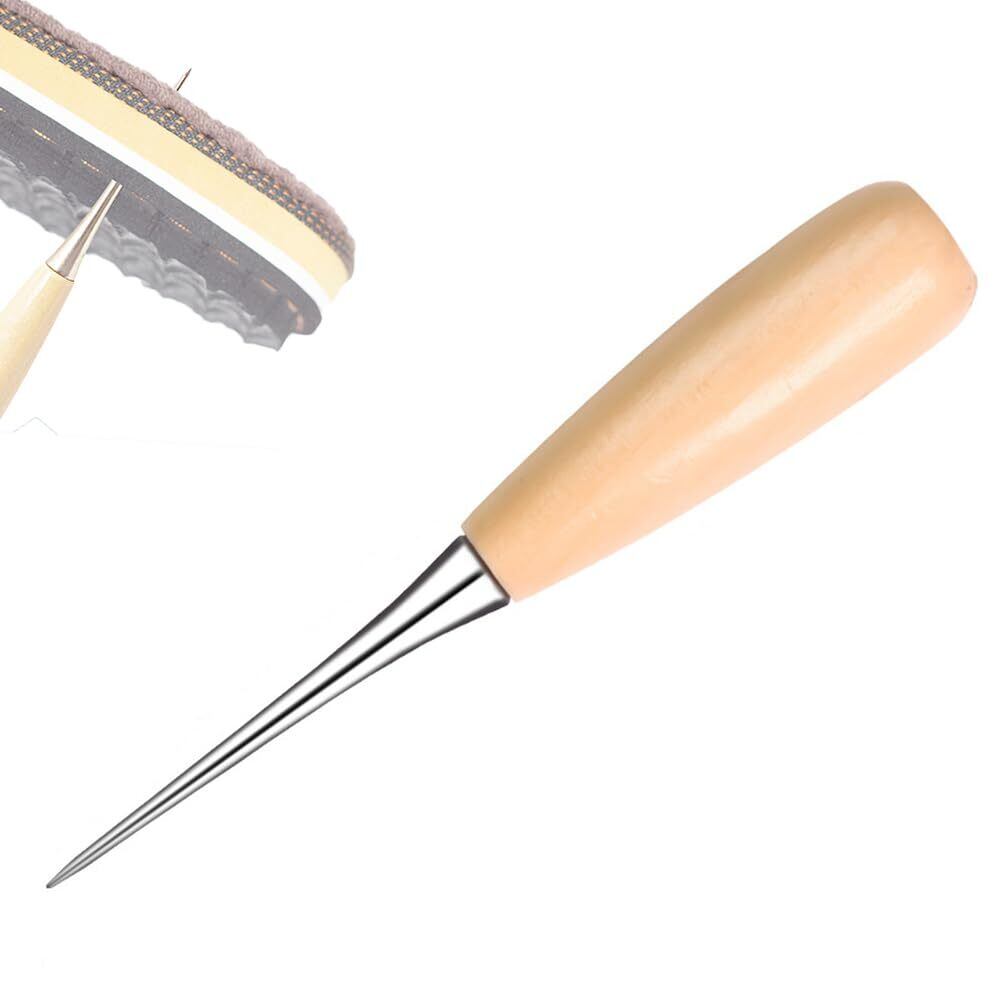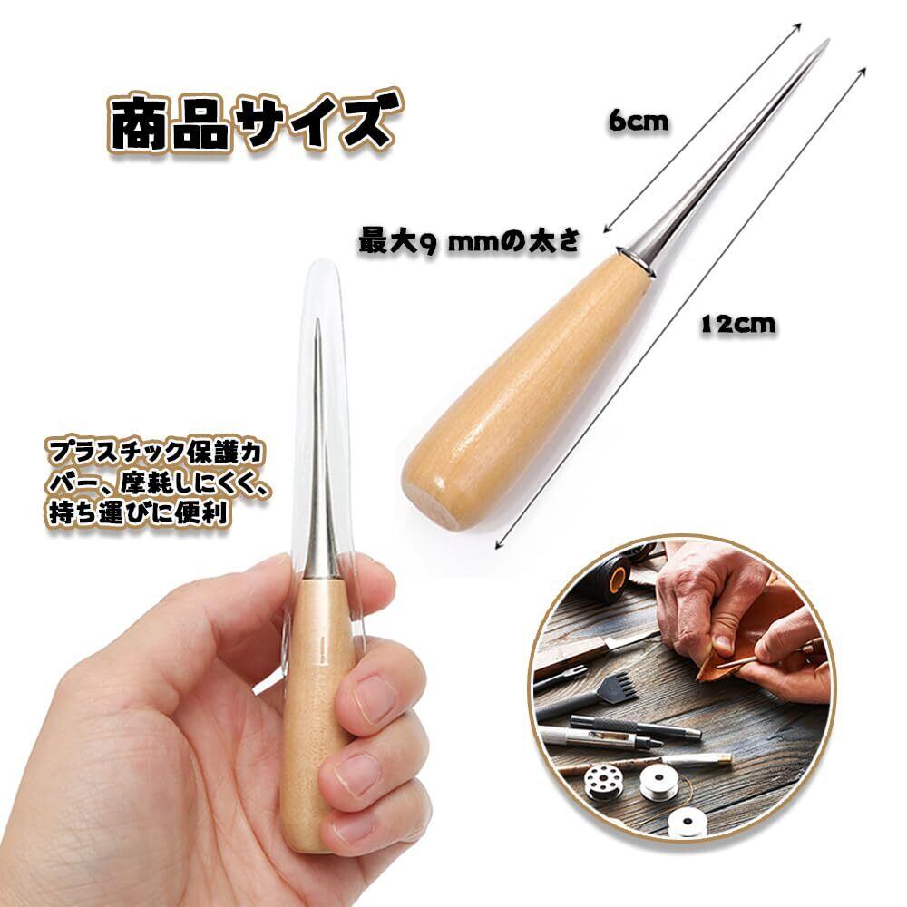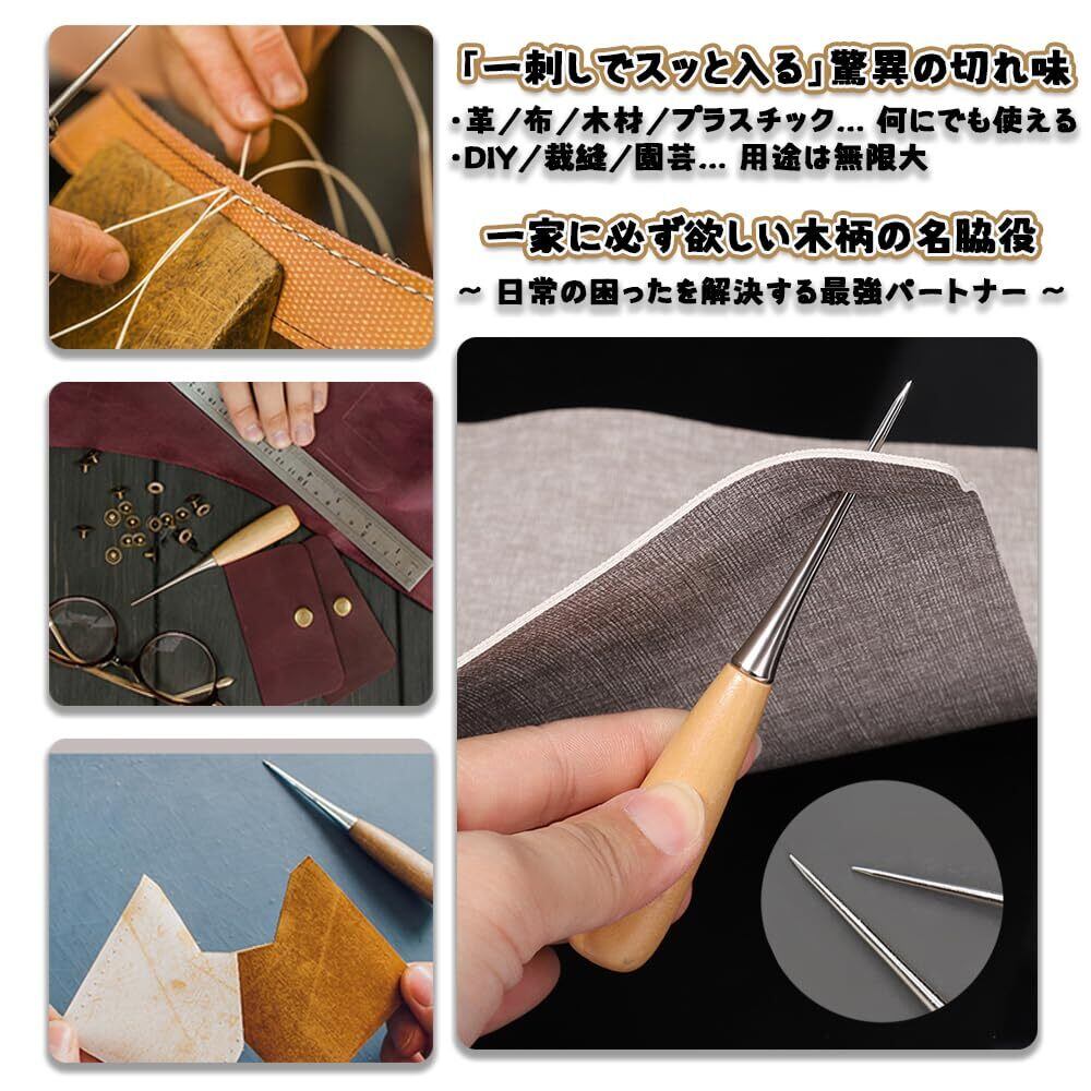 1. 天然木の手馴染み 国産ハードウッド(硬質広葉樹)採用の握り部分が、長時間の革細工でも疲れにくい手触りを実現。木目調グリップが職人の手元作業をサポート。 2.刃先62mmの実用設計 菱目打ち針に特化したSUS304ステンレス製先端(全長120mm)。先端62mmのスリム軸が薄革~厚底革まで1~9mmの穴あけを精密制御。 3. 和革専用の安全仕様 本革用に微調整された15度研磨角度(通常工具20度)。滑りにくい溝加工が、栃木革などの高密度皮革加工時の「ずれ」「過剰穴あけ」リスクを低減。 4. 多層材対応の汎用性 帆布8層・革5mmまで貫通可能な高剛性設計。バッグ金具取付~靴底修理まで、DIYからプロ用途まで対応する耐荷重性能。 5. 安全使用のポイント 研磨済み刃先の取り扱い注意。未使用時は付属のプロテクターカバーで保護可能。