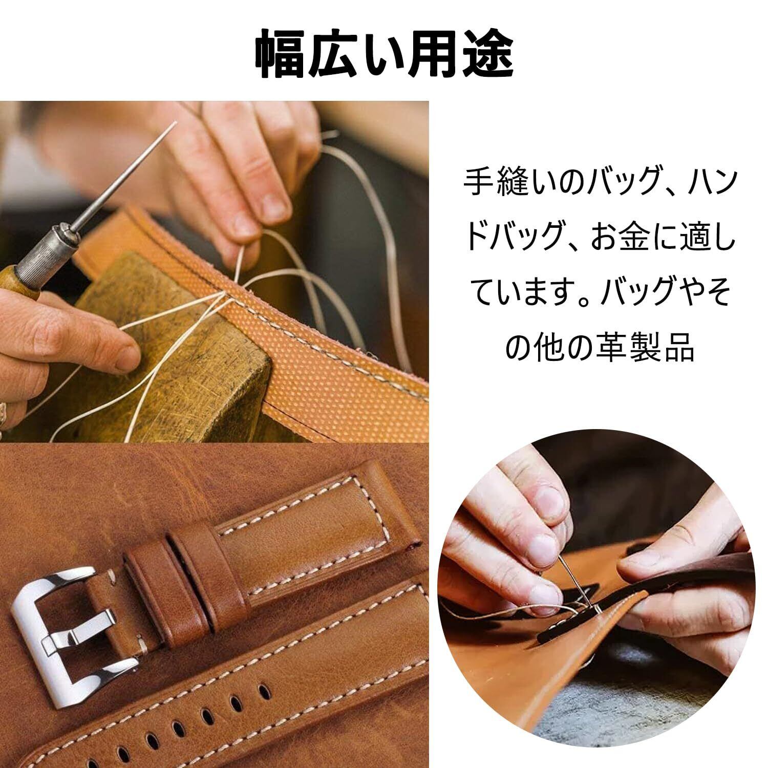 【高品質】当社の蝋引き糸は耐久性と長寿命を確保するために高品質の材料で作られています。引張強度と耐摩耗性を持つ同時に滑りが良く耐水性にも優れていて、ほとんどの皮革製品に適しています。