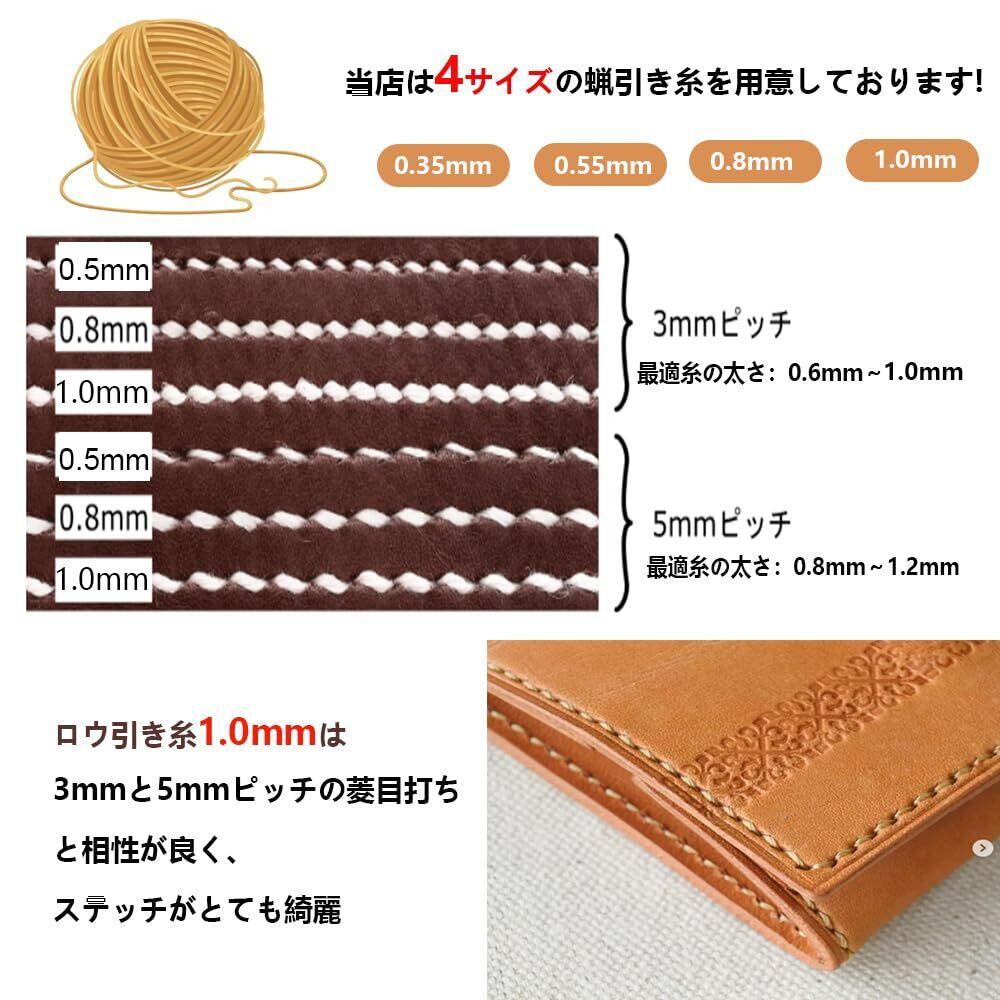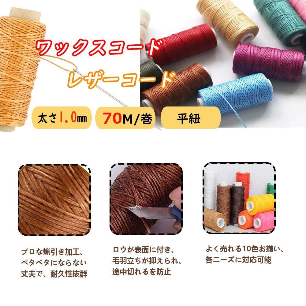 【1㎜ワックスコード】 ポリエステルろうびき糸、太めのステッチに仕上げたい場合や、 大きめのカバンを製作する際に適しています。 菱目打ちは5mm幅、6mm幅を使用する時にオススメです。長さは70M/巻、合計350Mもあり、お得なスレッドコードセットです。