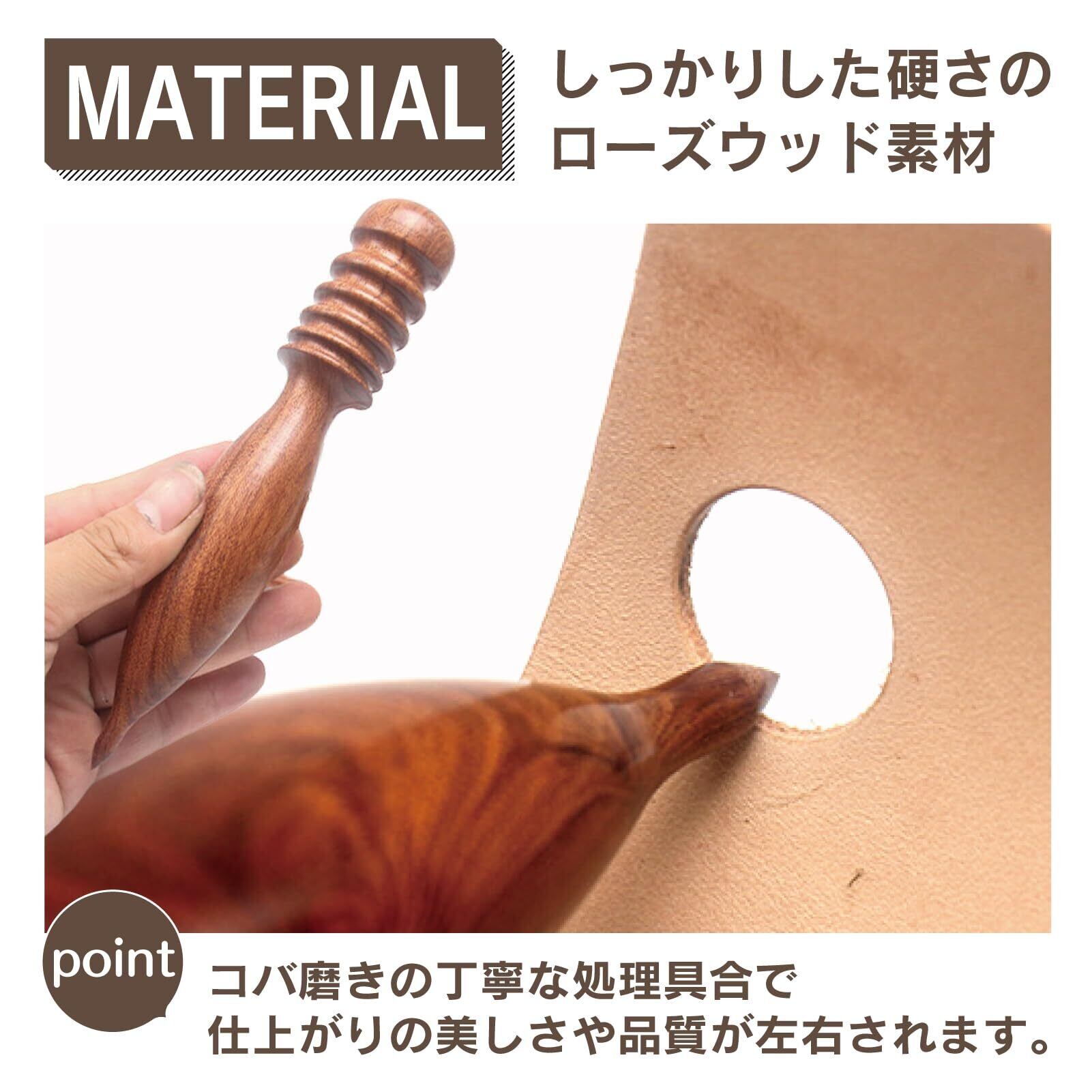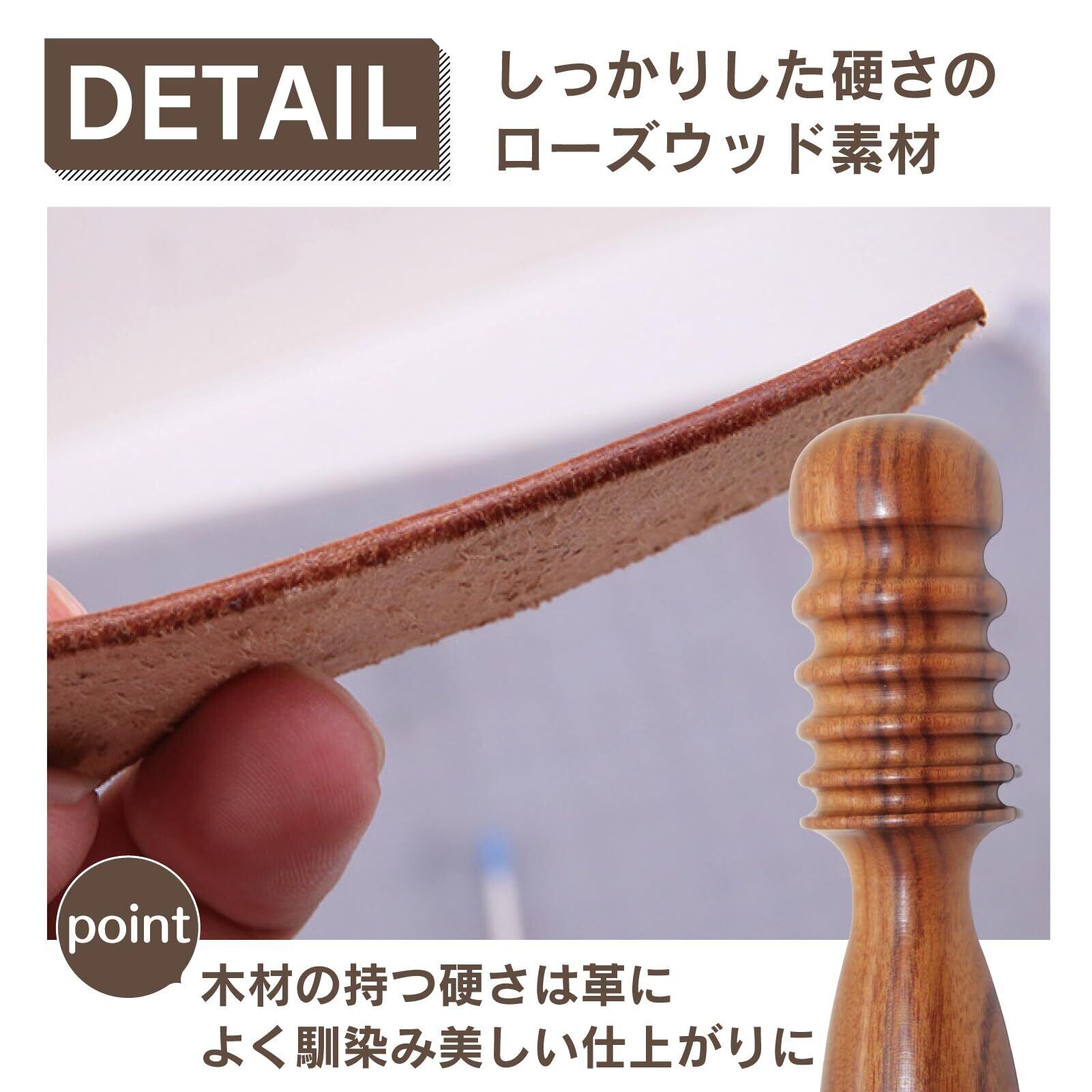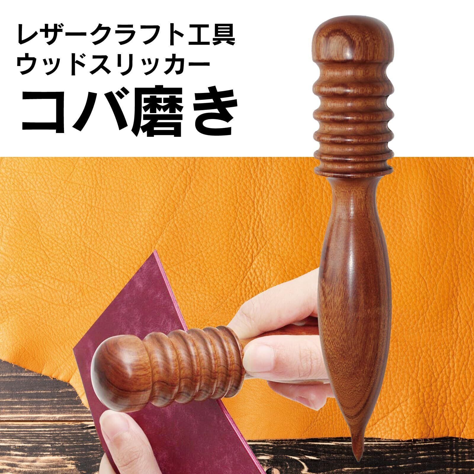高級家具に使われているローズウッドで作られたウッドスリッカーで、コバ磨きに重要な繊維がしっかり詰まった硬さがあります。木材の持つ硬さは革によく馴染みツヤを引き出しコバの美しい仕上がりが期待できます。
