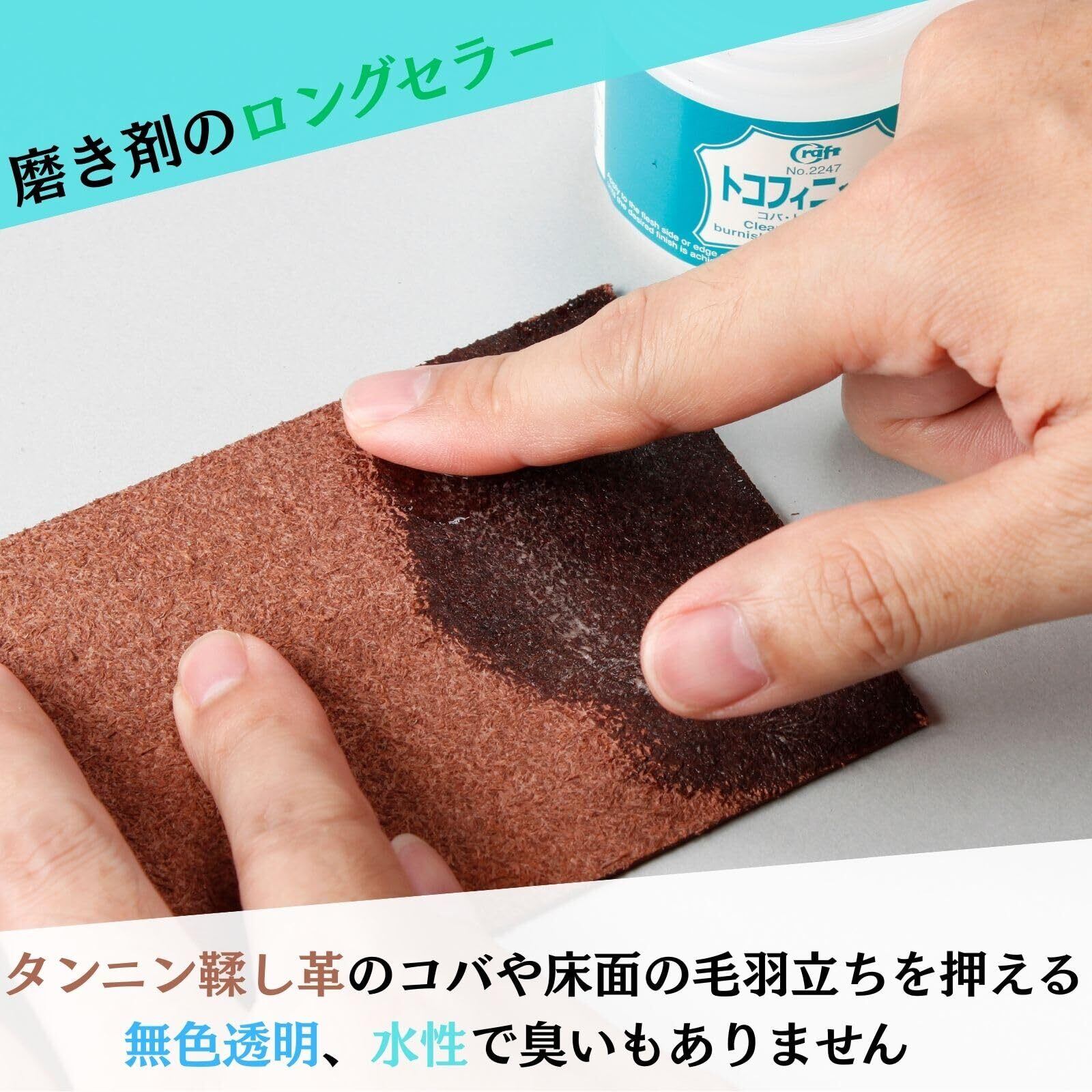 タンニン鞣し革のコバ・床面の毛羽立ちを押さえ、滑らかで艶やかに仕上げる無色透明の仕上げ剤です。 水性で臭いもなく、安全に使用できます。 使用方法:布や綿棒などでコバまたは床面にすり込み、半乾きの状態でヘリみがきなどを使い擦って磨きあげます。 床面の磨きにはガラス板などを利用します。 用途:コバ・床面磨き剤 内容量:80ml 成分:水溶性樹脂、有機アルカリ、水 注意事項:用途以外に使用しない。