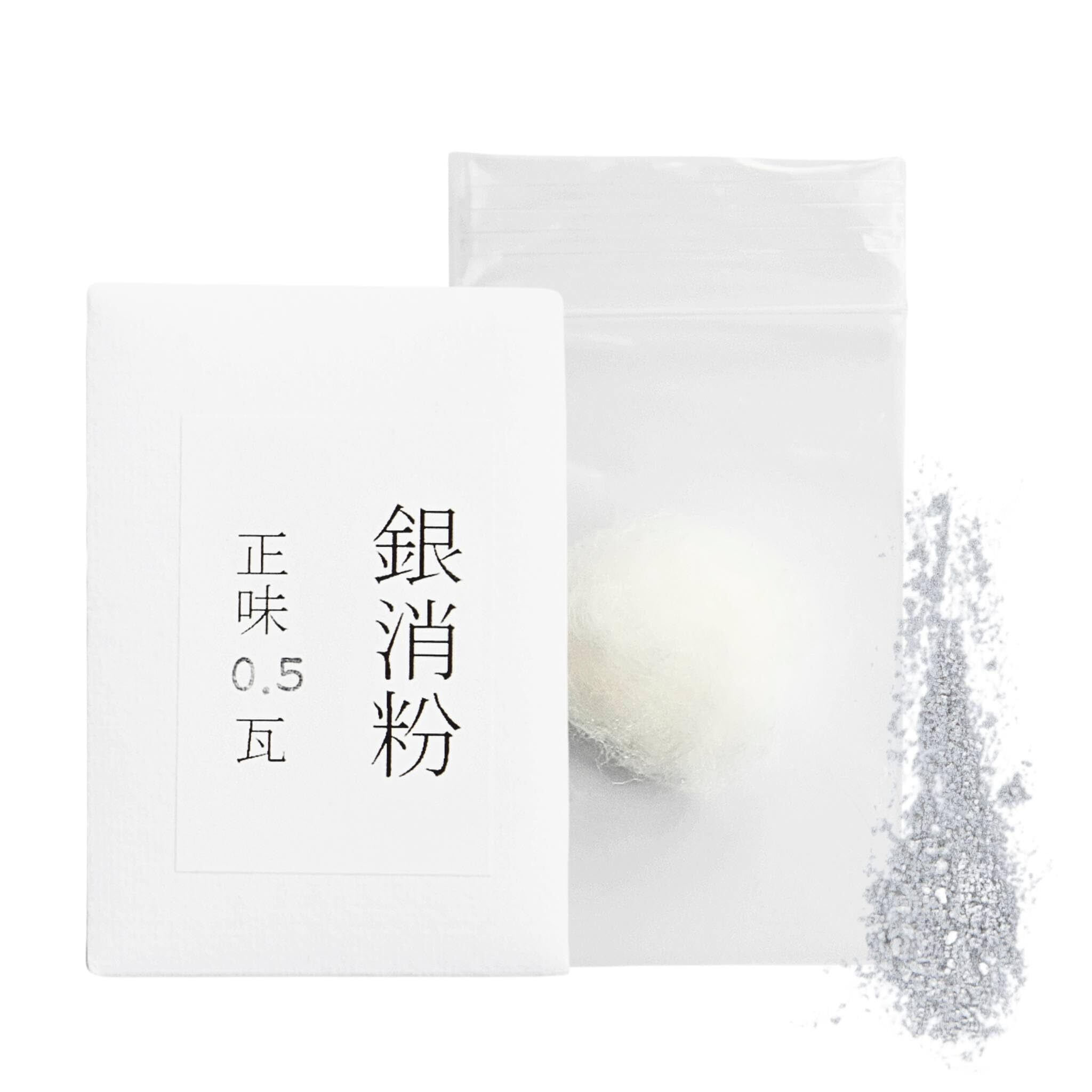 【金継ぎキットの補充用銀粉】もっと金継ぎしたい方のために、銀継ぎの最後の仕上げで使用する銀消粉(0.5g)の単品販売です。キットに含まれる量の2.5倍の量が入っており、いろいろな漆器や食器の補修にお使い頂けます。