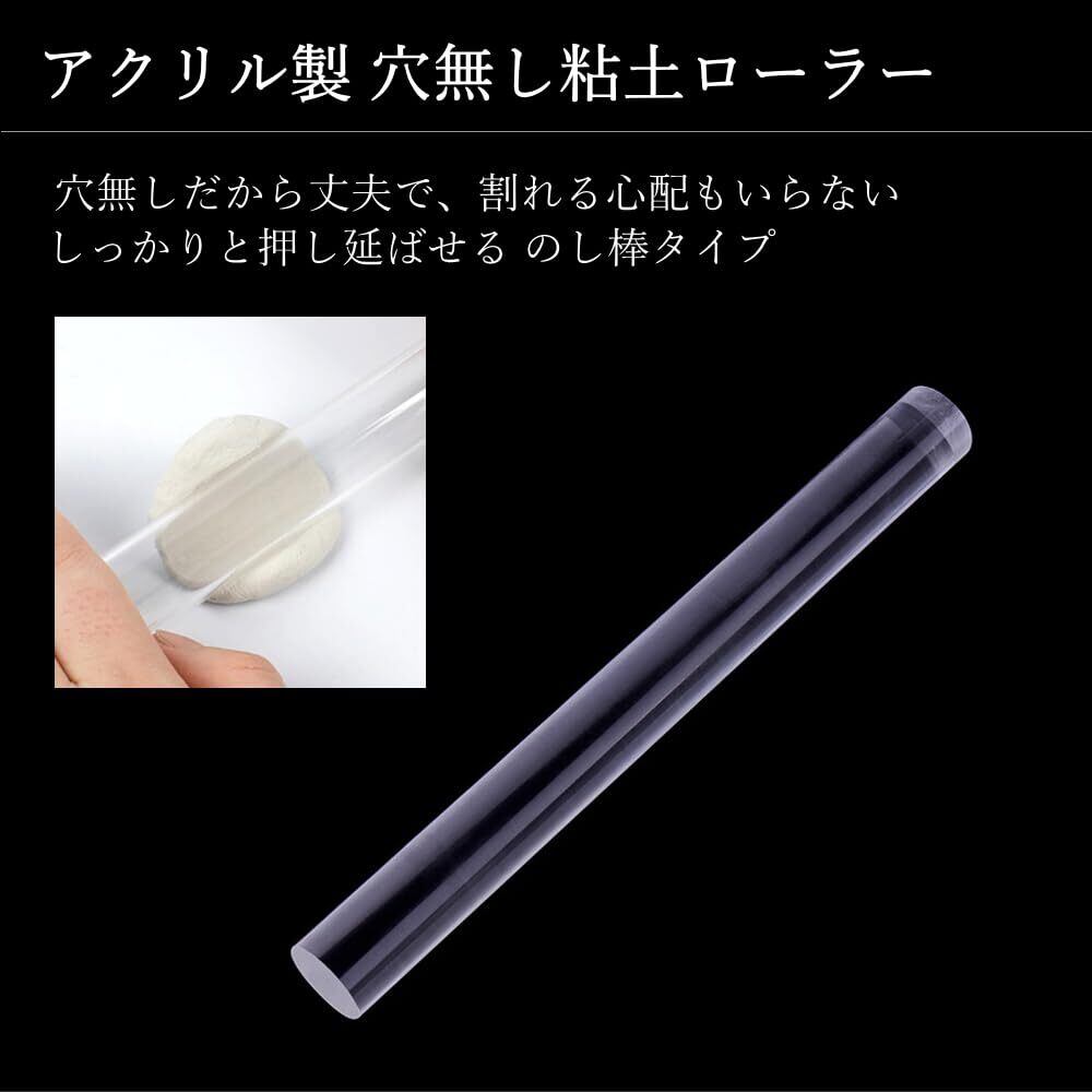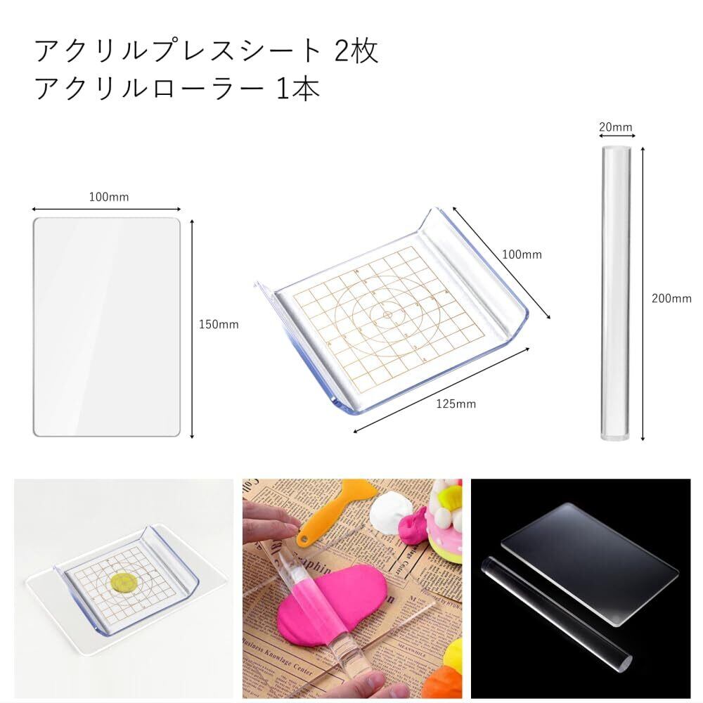 【商品内容】アクリル板:2枚/粘土ローラー:1本/スライサーブレード:1枚/ウェーブブレード:波(小・中・大)計3枚 ※ブレード部分は鋭利になっておりますため、お子様がご使用の際は、十分ご注意くださいますようお願いいたします。安全のため、保護者の方の監督のもとでのご使用をおすすめいたします。