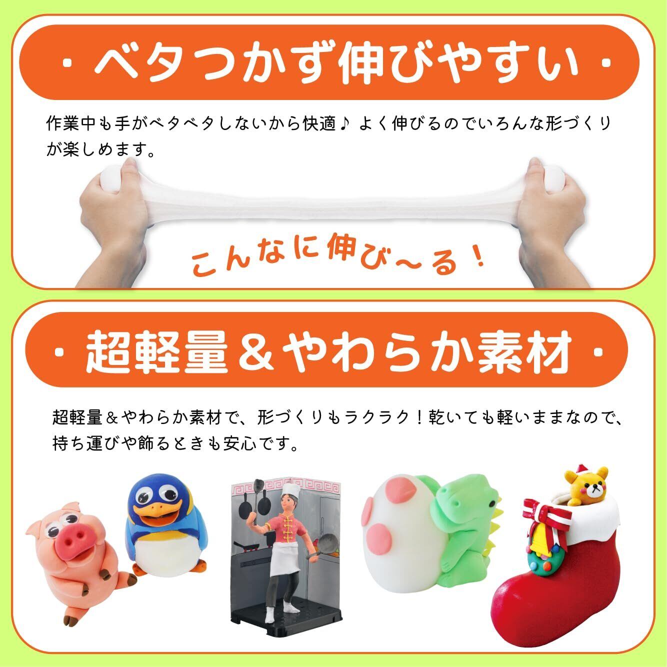 優れた質感と扱いやすさ: やわらかくて、こねやすく、よく伸びる工作に適した紙粘土です