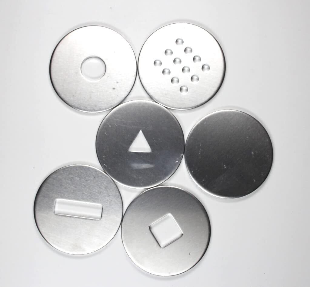 丸12穴:5.0mm, 三角:15.2mm ,四角:16.0mm ,丸:16.0mm, 長方形:31.6mm 。閉塞用1枚付き。