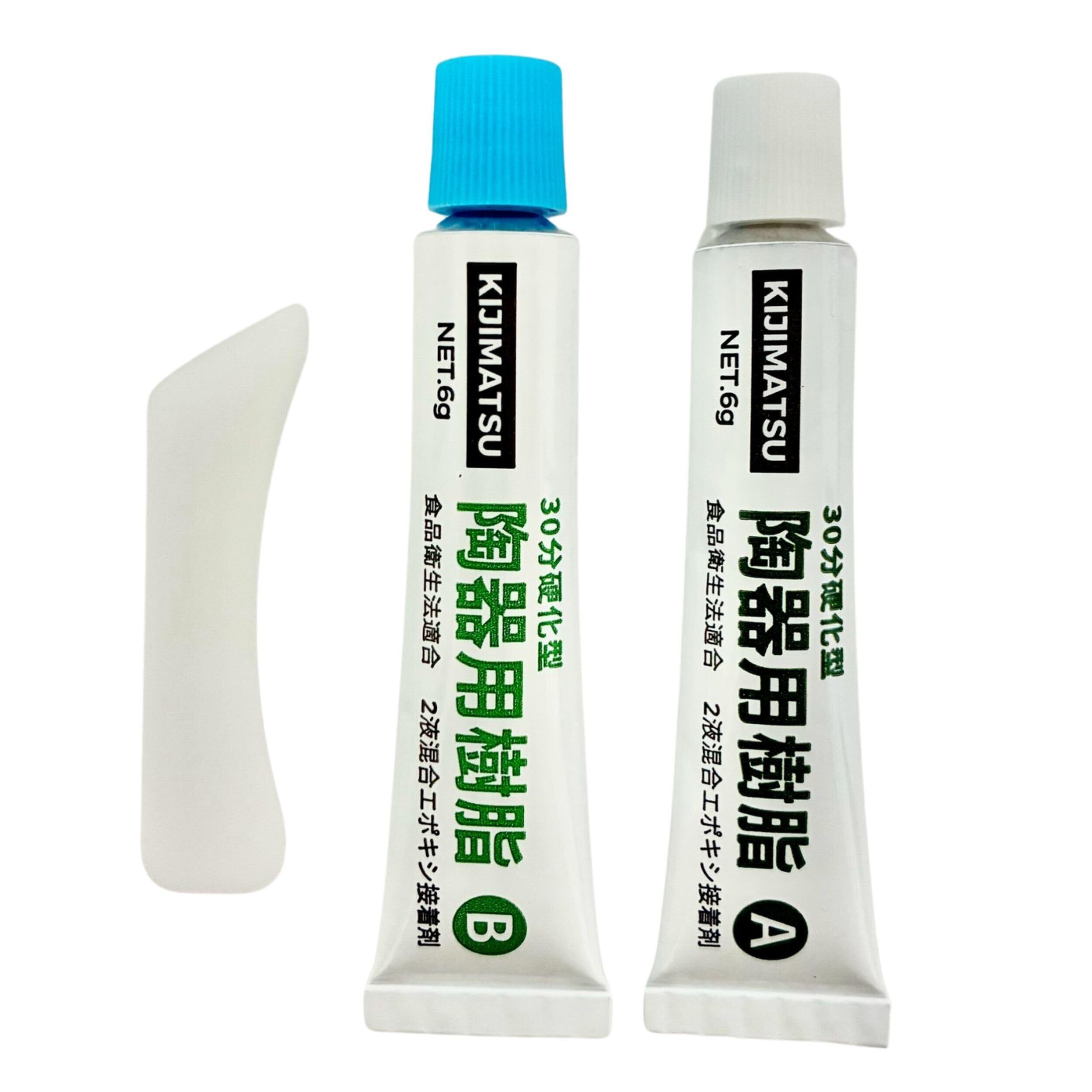 キジマツ「かんたん金継ぎセット」でご利用頂ける陶器用樹脂です。従来の新うるしの代わりとしてご利用頂けます。2液混合型のため、従来商品のような、経年により樹脂が固まる、ということがありません。 本商品は、金継ぎ作業での下記作業でご利用頂けます。 1)陶器用樹脂で破片をつなぐ(2液を混合し接着剤としてご利用) 2)錆(さび)うるしでの欠けや溝の修復(2液を混合し、砥の粉やテレピンと混ぜて錆うるしとして利用) 3)金継ぎの仕上げ(真鍮紛と混合して装飾)