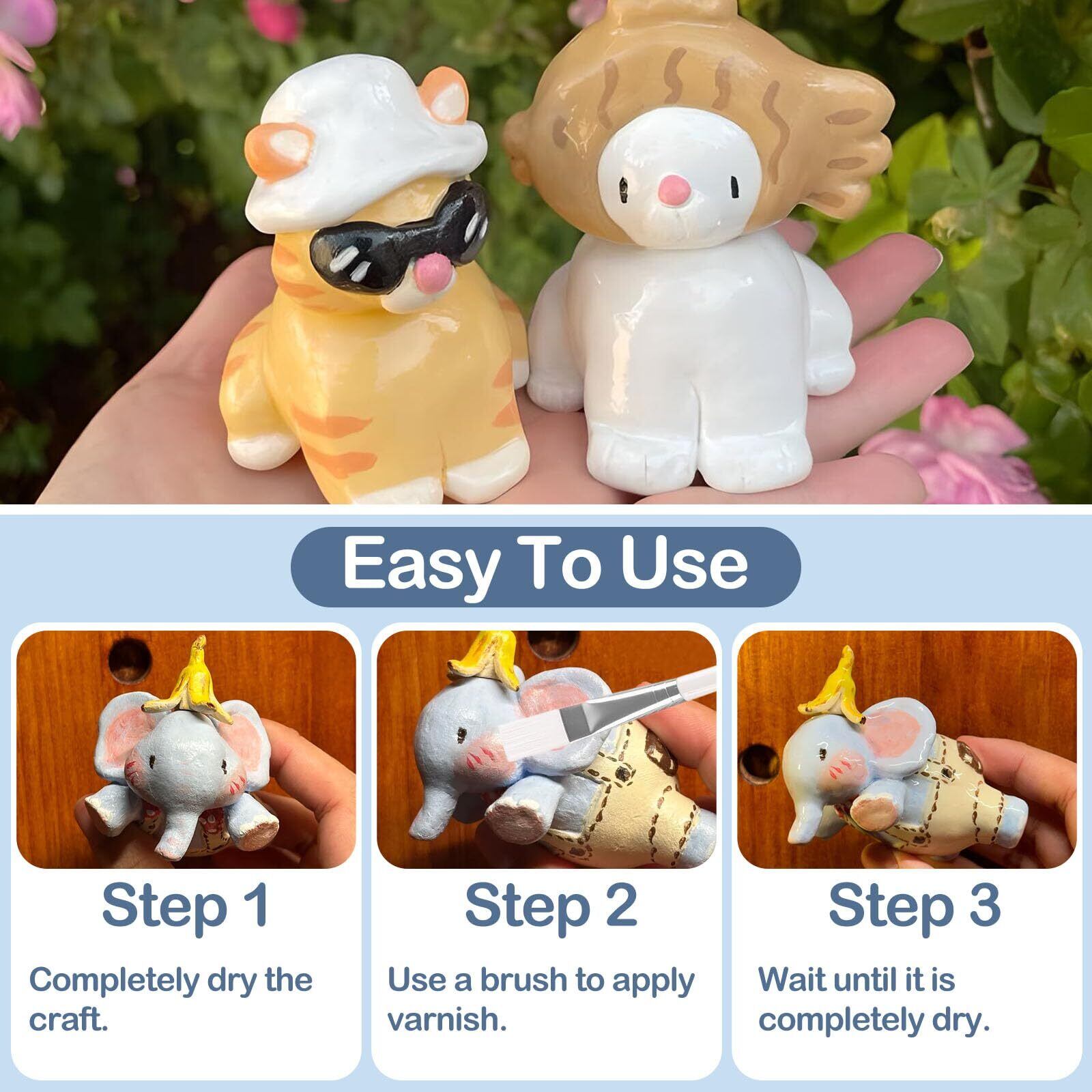 素早く簡単 - 完全に乾燥したエアドライ クレイにクレイ ワニスを厚く数回塗り、完全に乾くまで待つと、美しいマット効果が得られます。とても便利で、自宅で簡単に防水作品を作ることができます