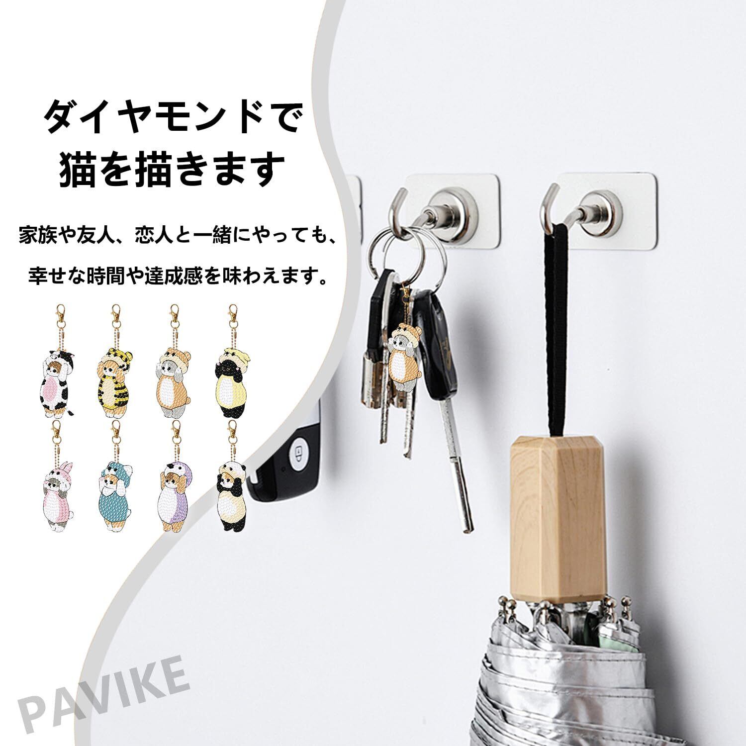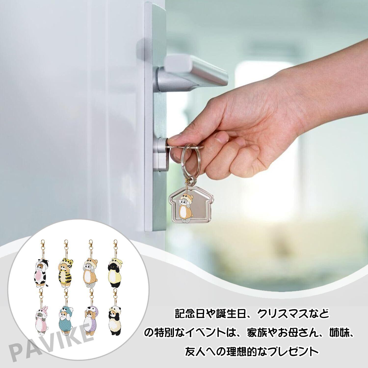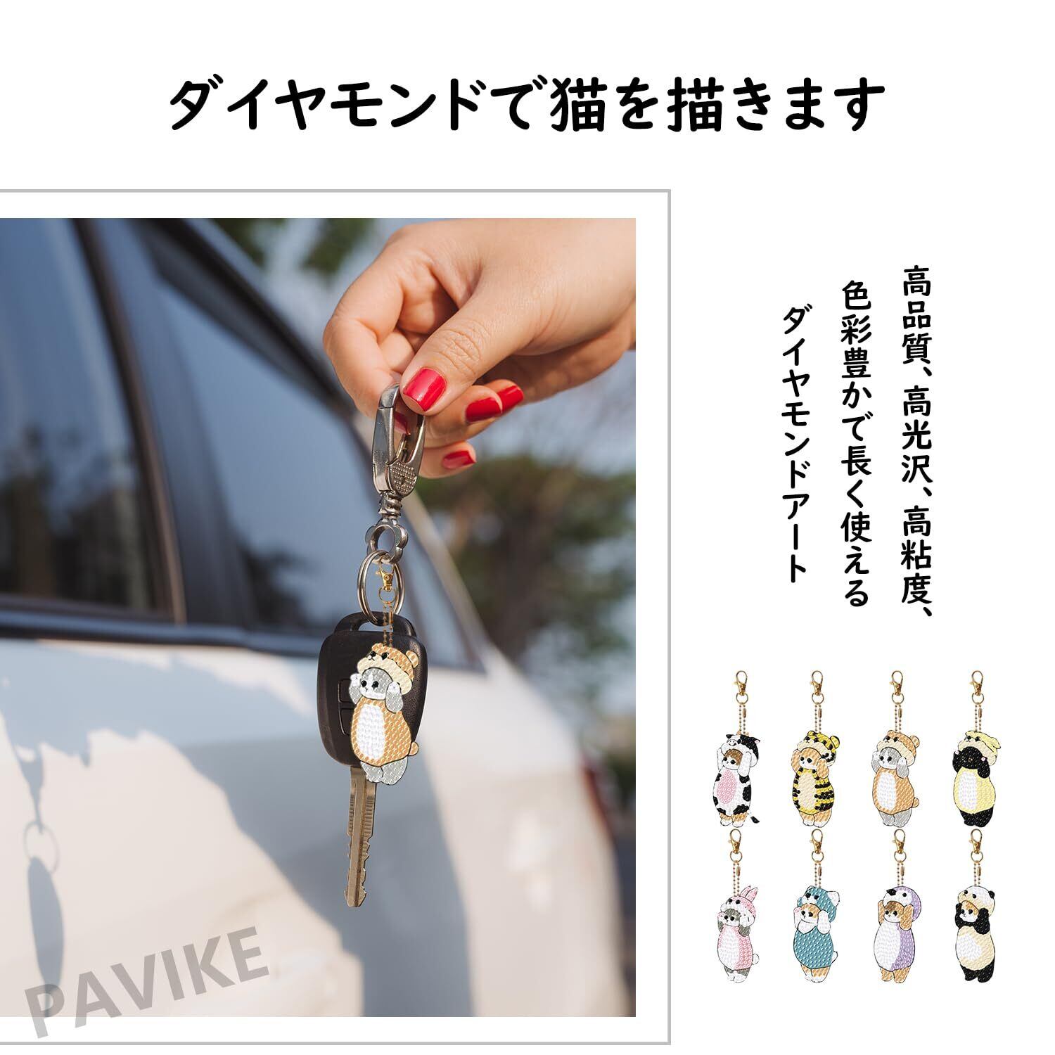 【豊富なセット内容で創作をすぐスタート】猫デザインに特化した DIY ダイヤモンドアートキーチェーンセットで、ダイヤモンドプレート*8、キーチェーン*8、足量のダイヤモンド、ドットダイヤモンドトレイ*1、ドットダイヤモンド接着剤*1 を一括同梱。追加で工具を準備する必要がなく、受け取ったらすぐにハンドメイドの楽しみを味わえます。