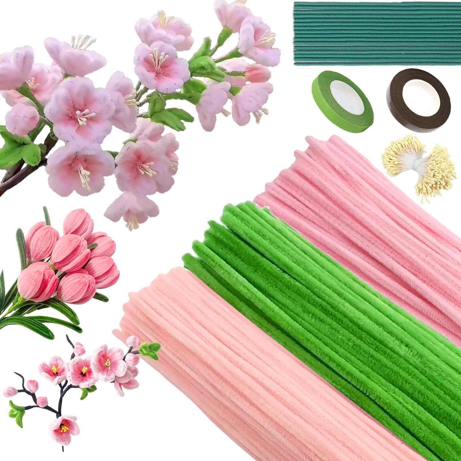 手芸モール カラーモール 工作モール 300本 人工花茎30本 双頭花おしべ400本 テープ2巻 ピンクの花 モールアート 桜 梅 手作り 春の花 花束工作キット 造花DIY 曲げ可能 造形材料 記念日 誕生日 卒業式 母の日 贈り物に最適