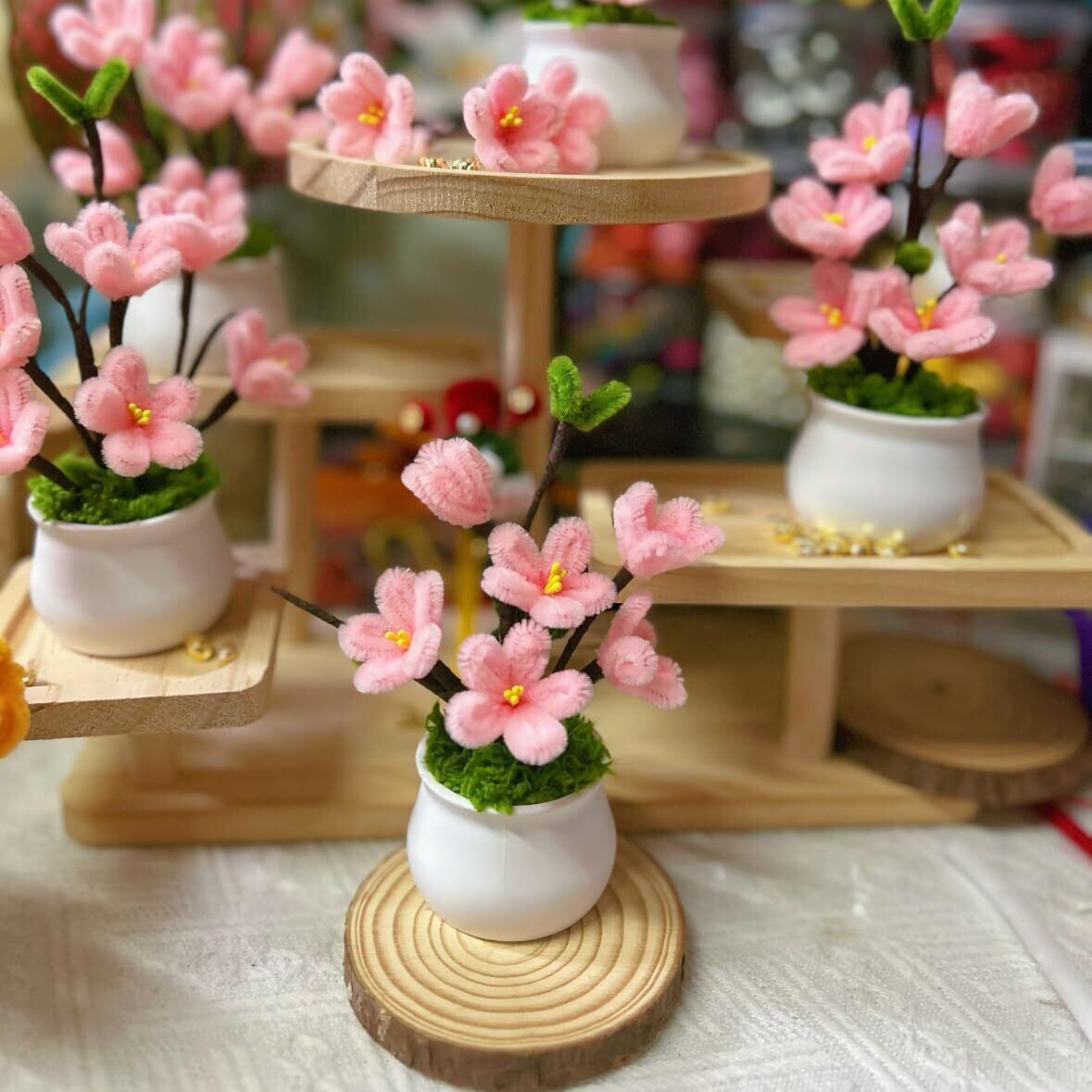 春らしい桜カラーのモールセット:薄いピンク、桜色、緑など、桜の季節にぴったりのグラデーションカラーをセットにしました。花おしべ、花茎、テープなど、手芸に必要な材料も入っています。春のクラフト作品のイメージが広がります。