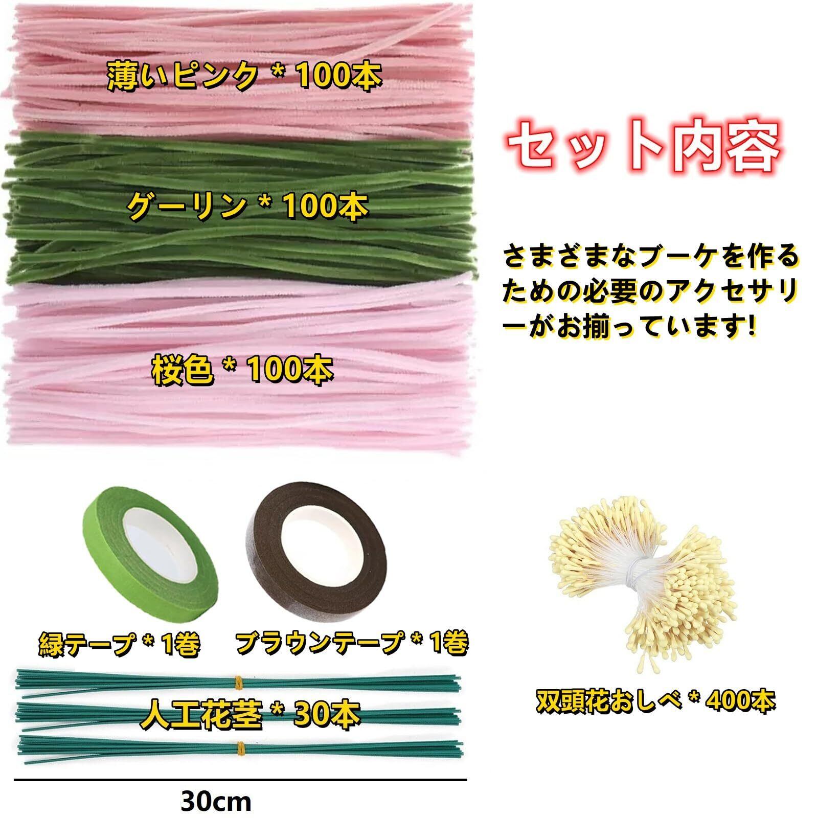 商品仕様:サイズ:花茎の長さ30cm、モールの長さ30cm、セット内容:薄いピンク*100本+桜色*100本+グーリン*100本+人工花茎*30本+双頭花おしべ*400本+緑テープ*1巻+ブラウンテープ*1巻、さまざまなブーケを作るための必要のアクセサリーがお揃っています。