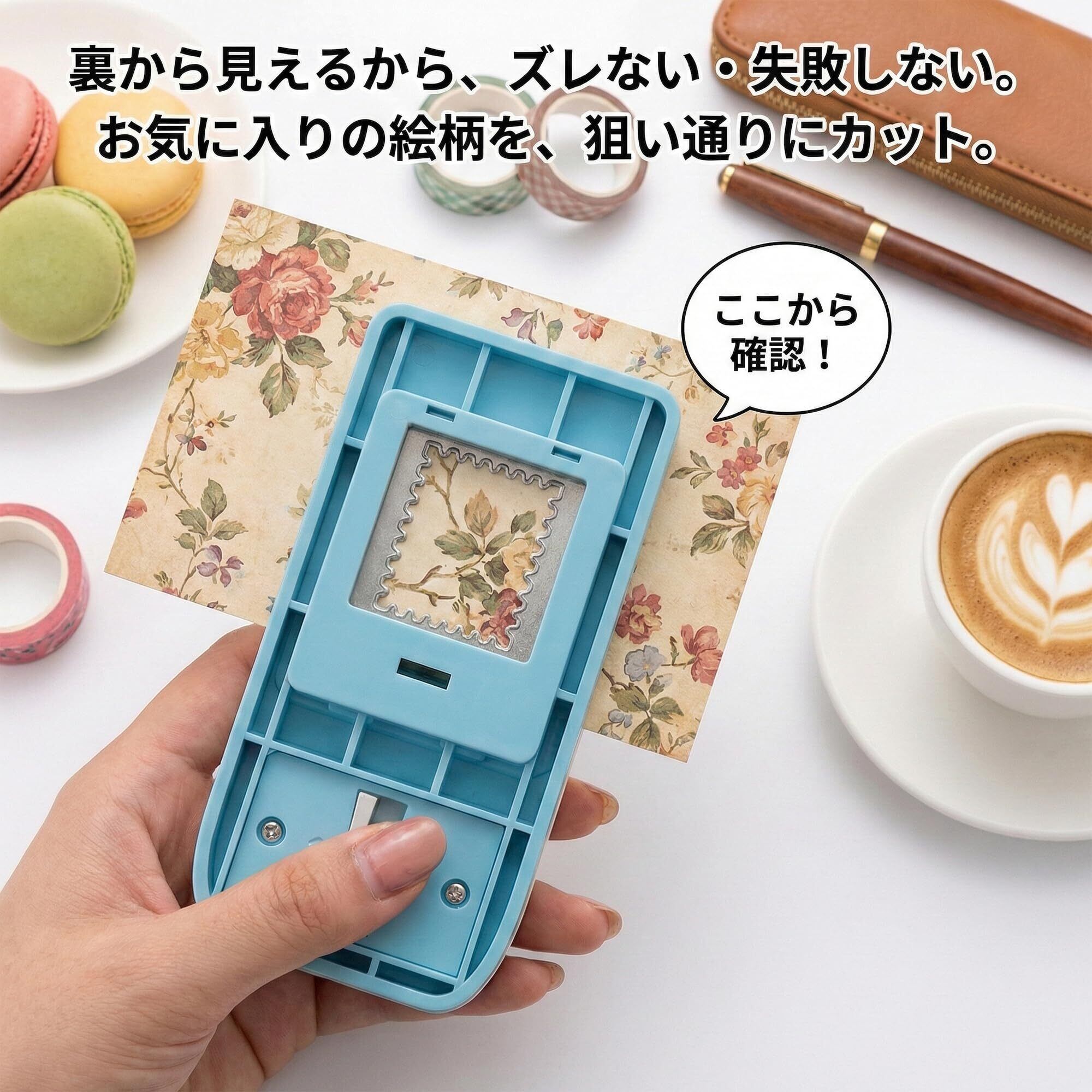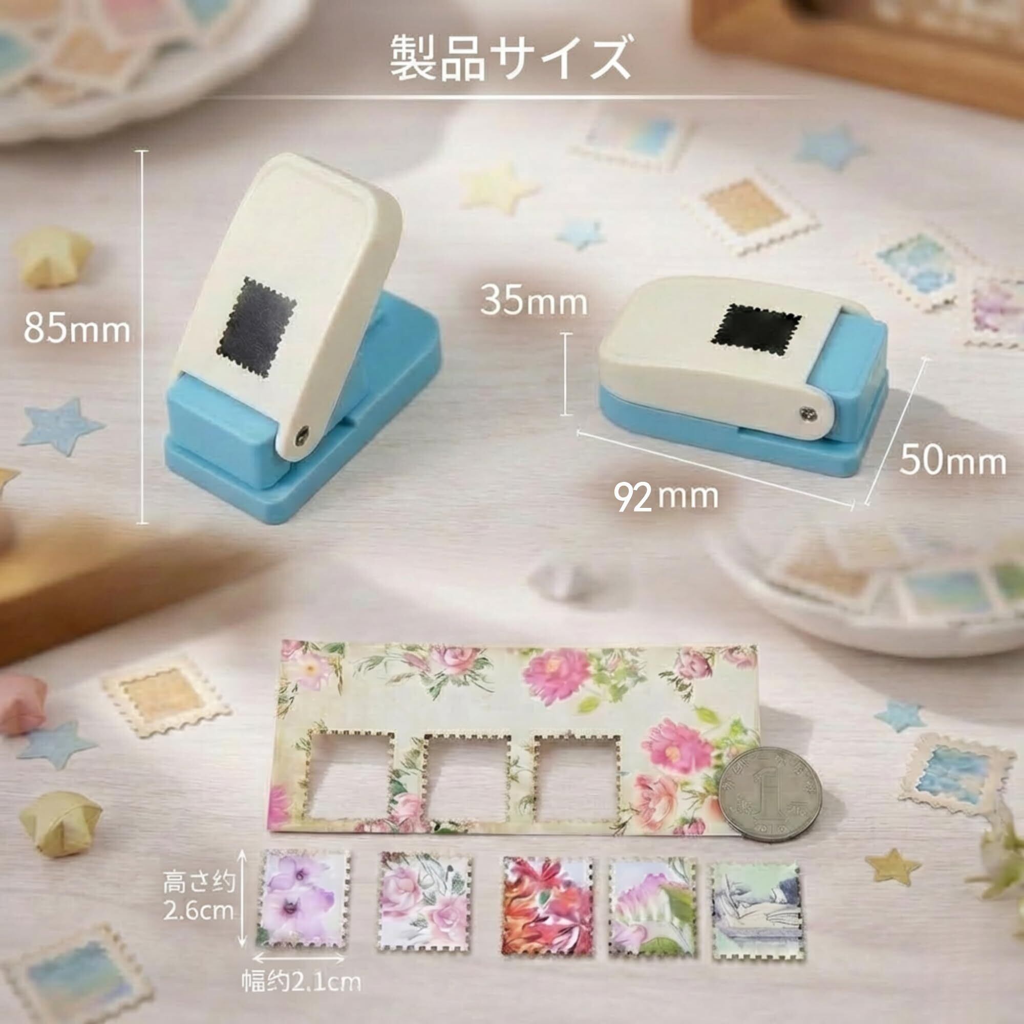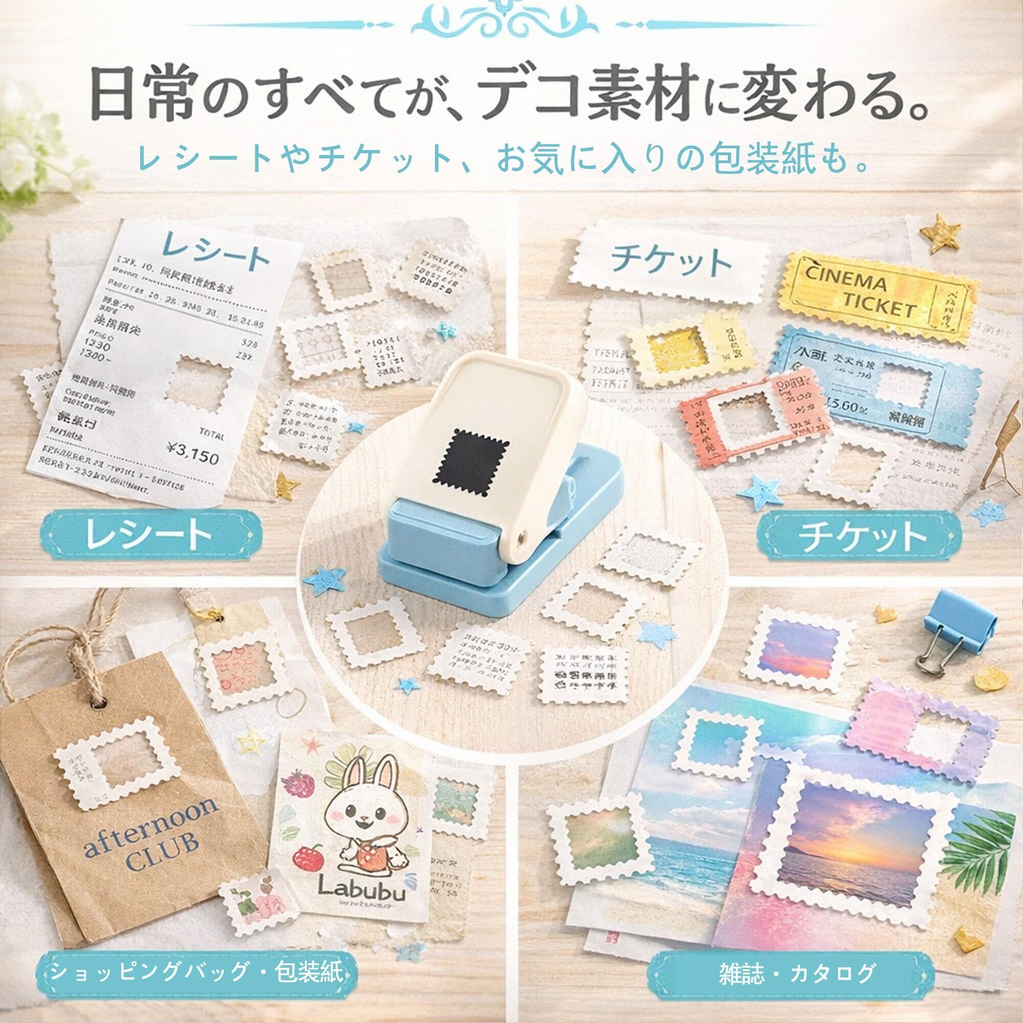 【一瞬でおしゃれな切手風に】普通の紙や写真が、ワンプッシュでレトロな「切手型」に早変わり。出図サイズは約25.4mm×21.1mmの黄金比で、手帳デコやコラージュに最適です。
