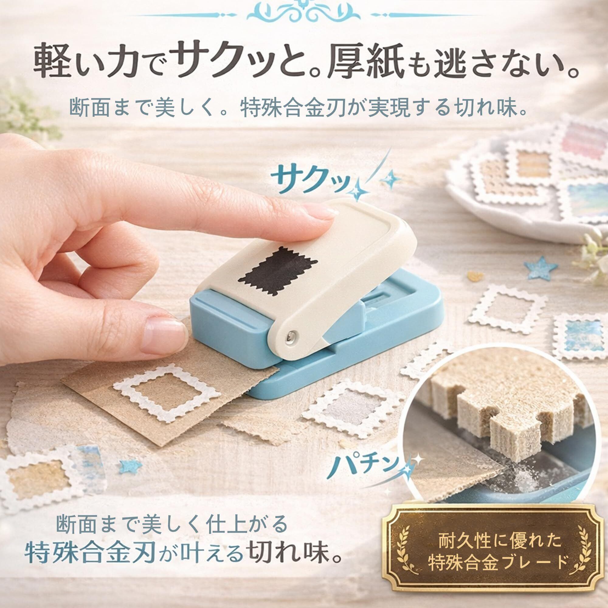 お手持ちの紙や写真を、ワンプッシュでレトロ可愛い「切手型」に変えるクラフトパンチです。本体サイズは約85×50×80mm、出図サイズは25.4×21.1mmの使いやすい黄金比を採用。人間工学に基づいたレバー設計により、軽い力でサクッと型抜きができ、厚めの紙でも毛羽立ちのない滑らかな切り口を実現しました。底面が開放されているため、絵柄を確認しながらの正確なカットも簡単です。手帳デコ、スクラップブッキング、コラージュ、大切な方へのメッセージカード作りなど、日常のDIYやハンドメイドをより華やかに彩る万能アイテムです。