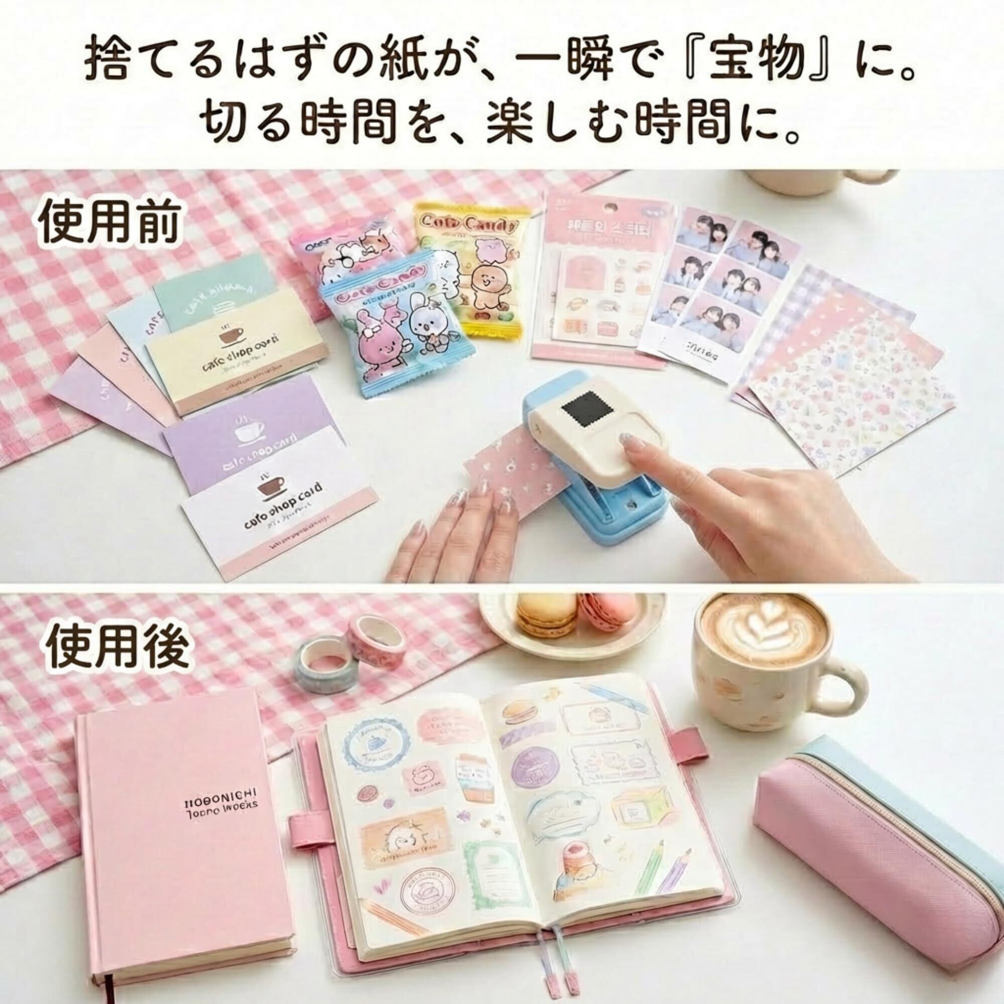 【素材を選ばない万能パンチ】 カラーペーパー、マステ、写真、雑誌など多用途に対応。アルバム作り、ギフトラッピング、メッセージカードの装饰など、自分だけのオリジナル作品を量産できます。