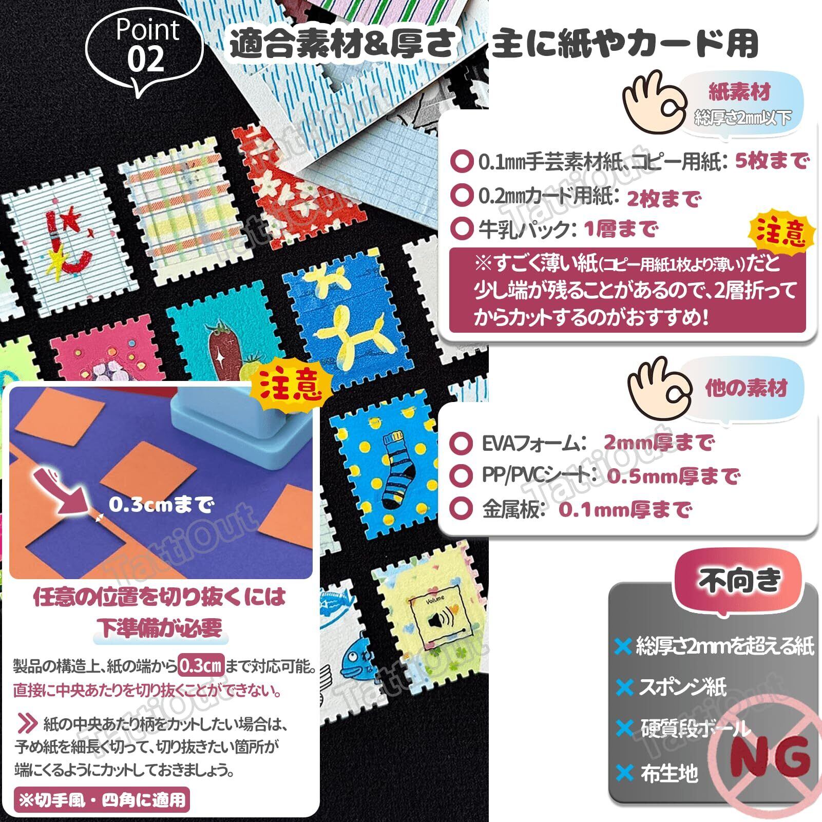 ■【重要!!!型抜きコツ:任意の位置を切り抜くには下準備が必要】製品の構造上、紙の端から0.3㎝までにしか対応できないので、直接に中央あたりを切り抜くことができない。※紙の中央あたり柄をカットしたい場合は、予め紙を細長く切って(つまり紙を切り抜きたい部分の0.3㎝までは事前に切って)、切り抜きたい箇所が端にくるようにカットしておきましょう。