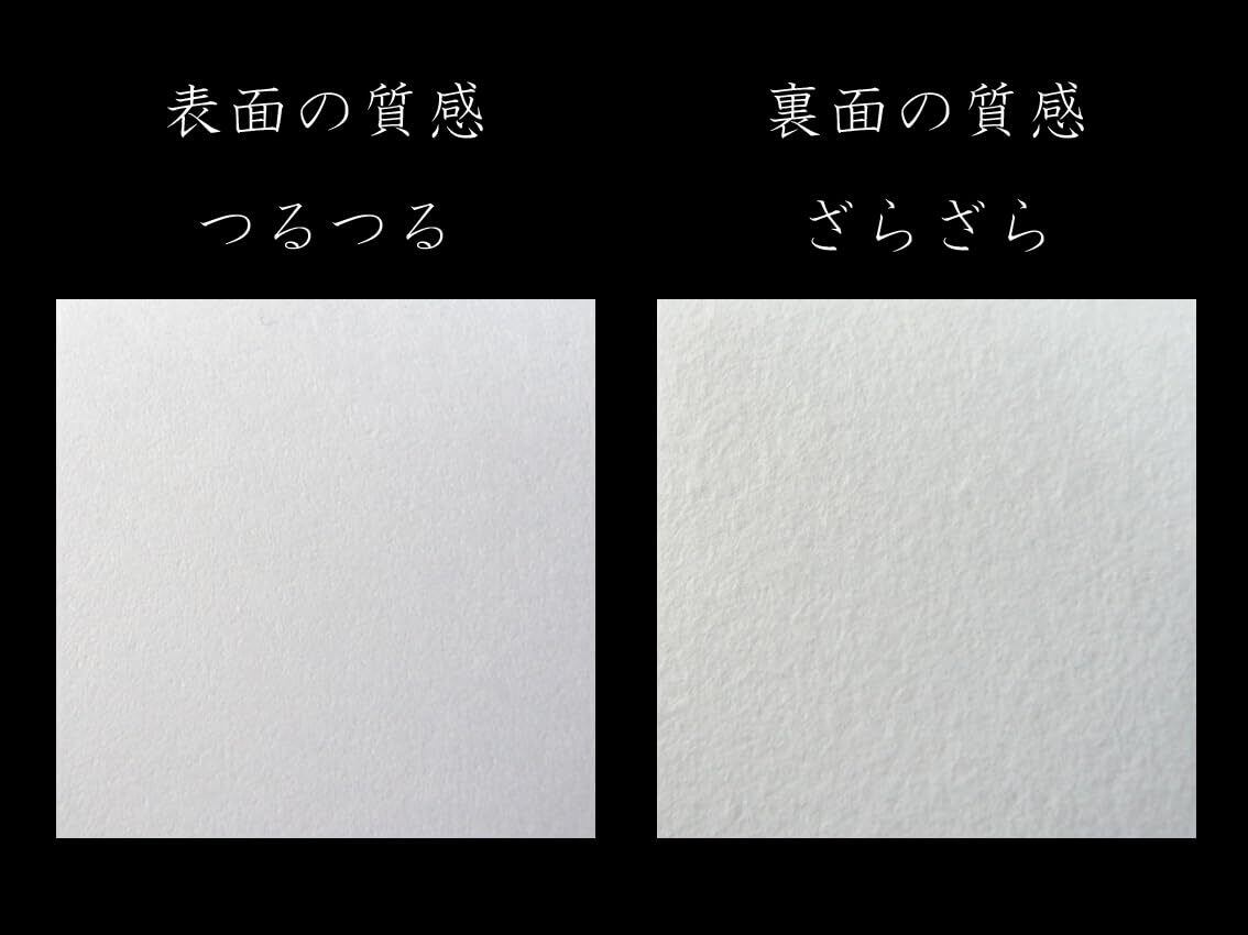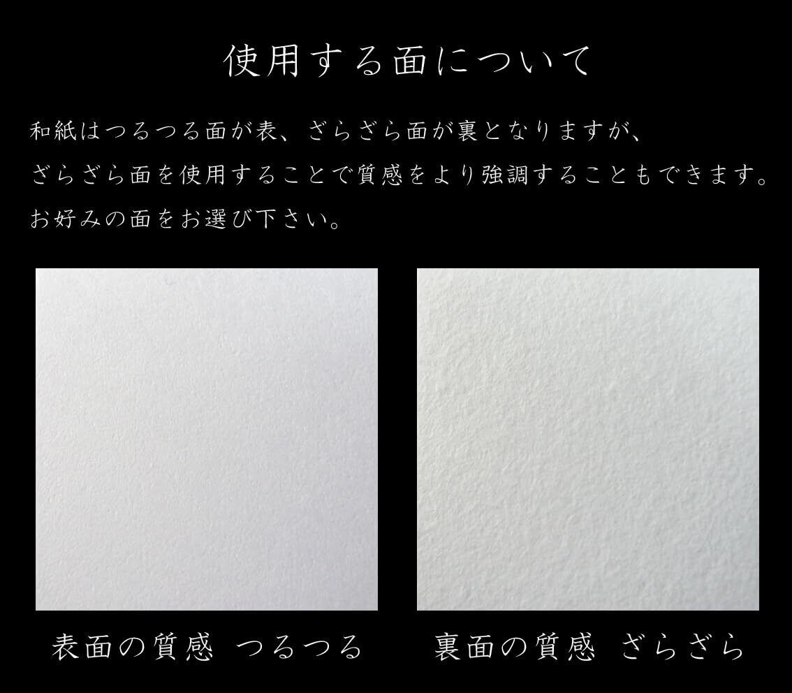 【使用する面について】一般的に、つるつる面=表、ざらざら面=裏とされておりますが、ざらざら面を印字などに使用することで、質感の強調も可能です。お好きな面をお選び下さい。プリントの際は和紙の間に空気を入れるようによくほぐしてからご使用ください