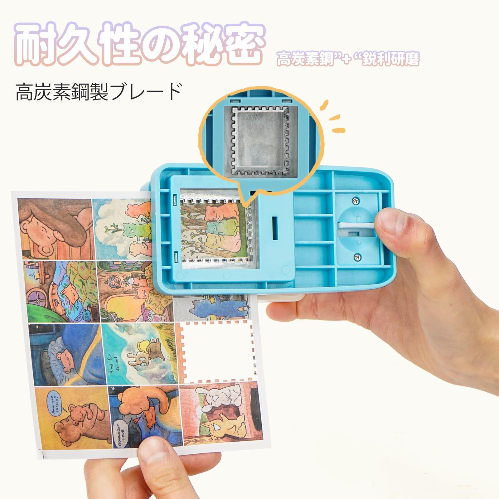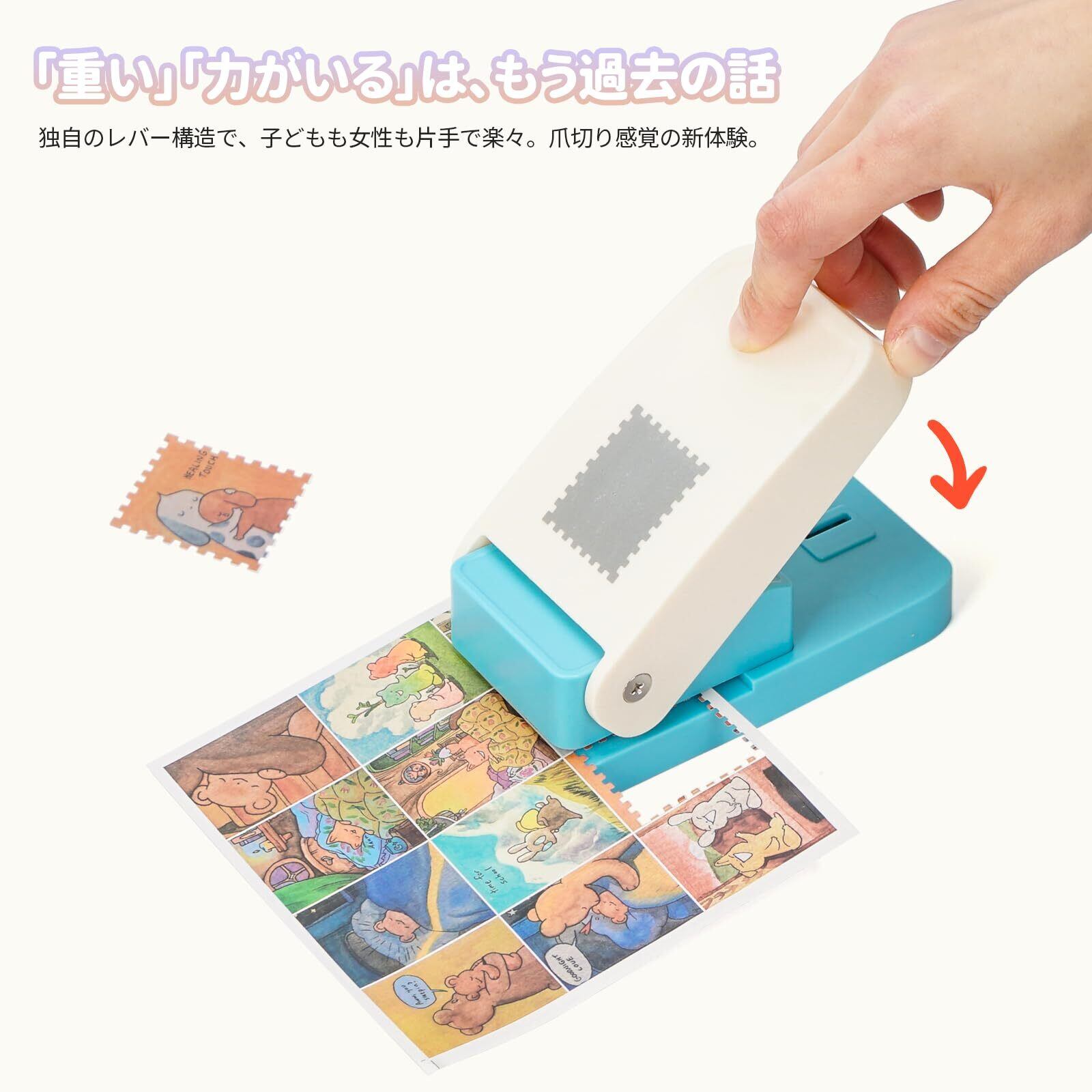 1. ️【切手風デザイン・省力レバー式なクラフトパンチ】 郵便切手をモチーフにしたクラフトパンチ。独自のレバー構造により、サクっと軽い力で押すだけで、約3.2×3.8cmのピンとした美しい長方形を紙に一度で打ち抜けます。操作は非常に簡単で、子どもから大人までストレスなくご使用いただけます。
