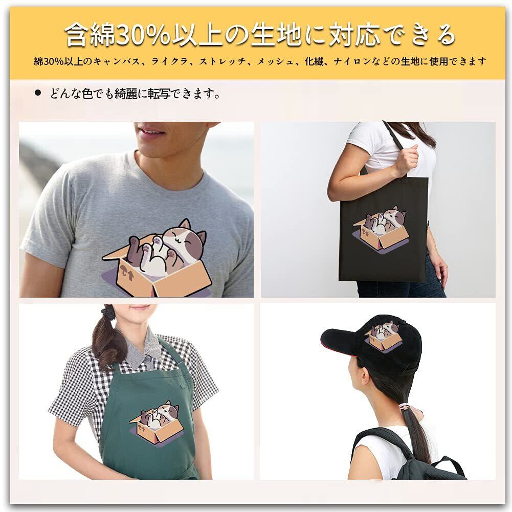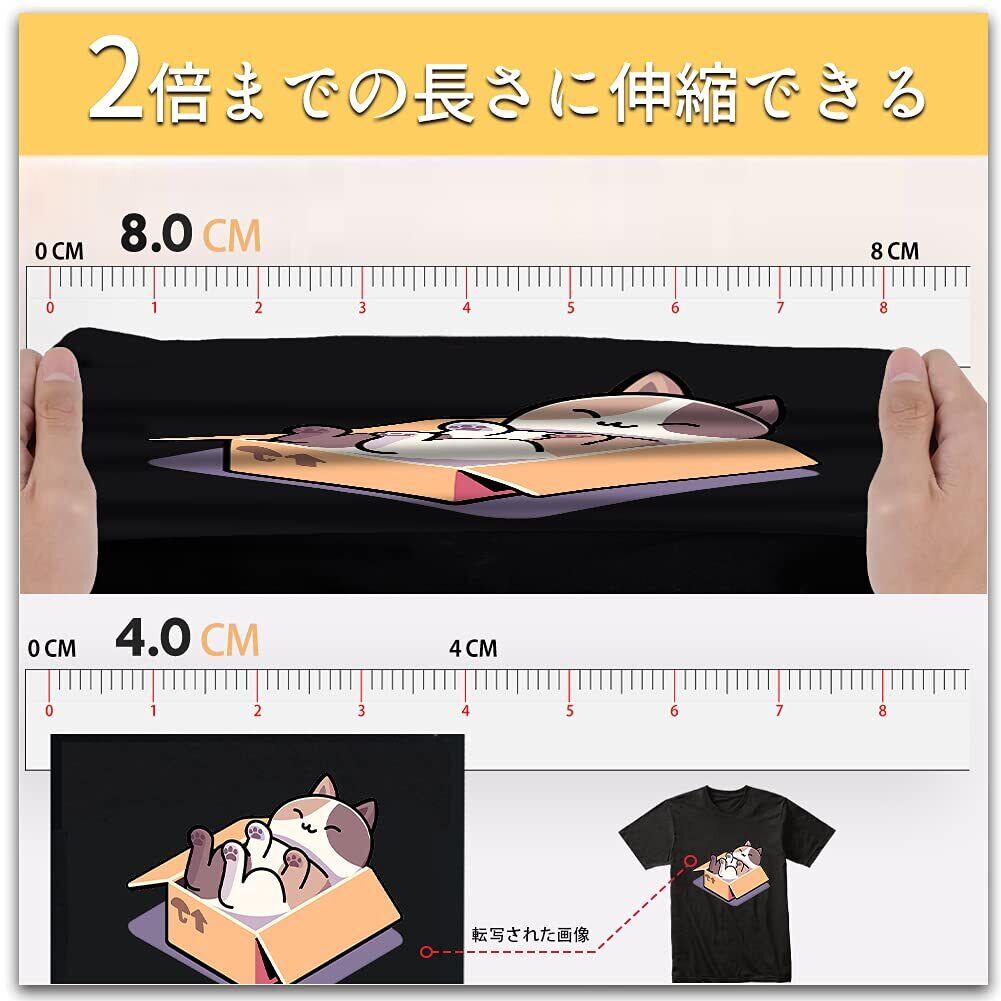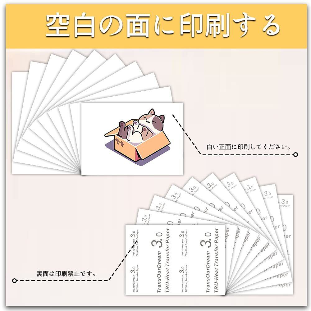 特性:インクジェット・レーザープリンター共用、正像印刷、転写簡単、洗濯に強い、優れる耐久性、鮮やかな色 高温耐性:特殊な日焼け止めコーティングを開発しました。紫外線強度15にも色褪せや黄色になりません。 抜群の接着性:シワなし!洗濯に強い!33回以上洗濯しても鮮やかな色を持ち続けます。 高通気性:シートの厚さ(台紙除く)は僅か0.12㎜です。仕上がりは柔らかな肌触です。