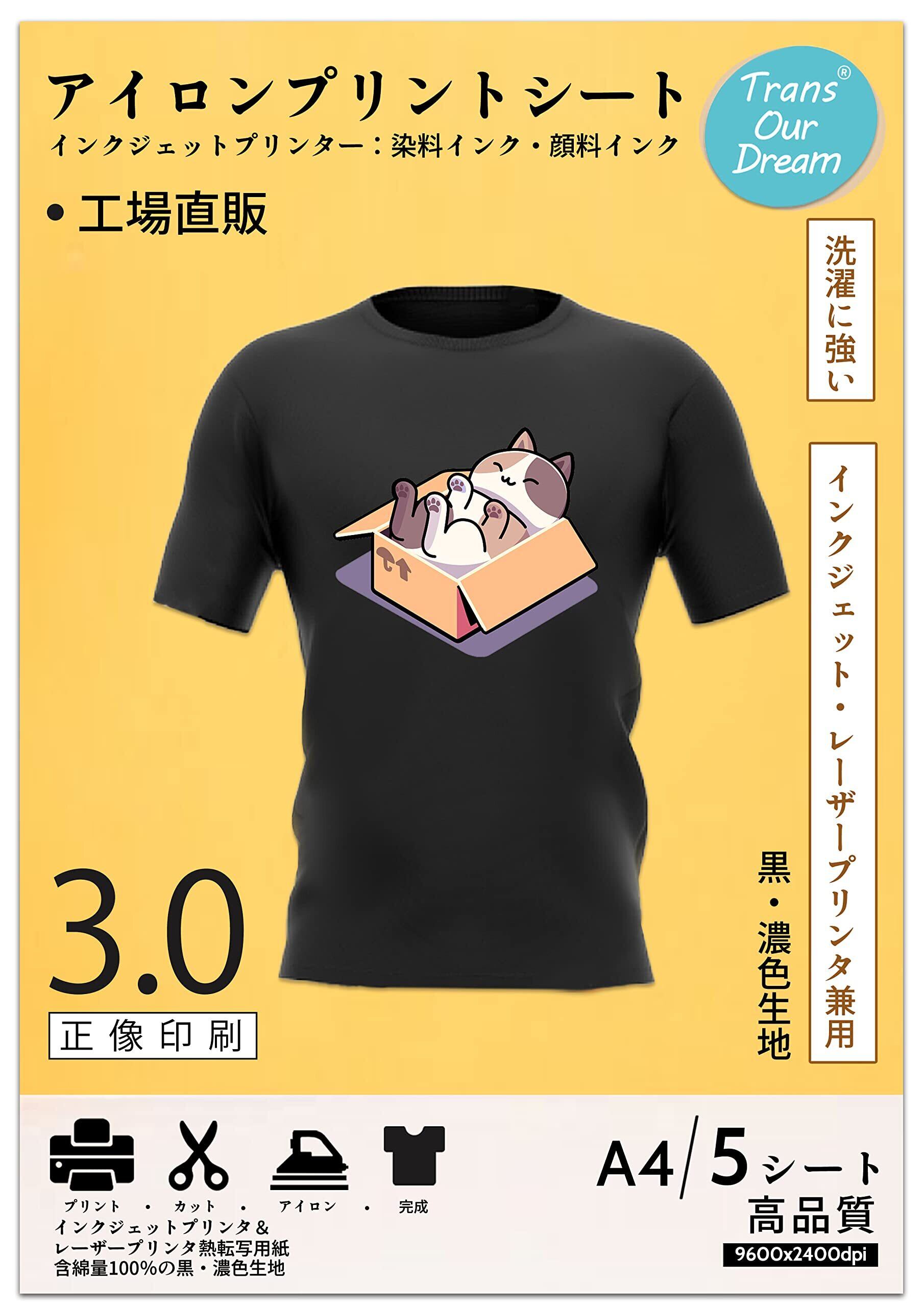 【新春セール】TransOurDream 真正のアイロンプリントシート 黒・カラー生地用 A4 5枚 転写紙 アイロンプリント用紙 インクジェット・レーザー共用 Tシャツ転写シート 熱転写シート アイロン転写シート 濃い色用 洗濯に強い 布用 JP-B-3-5
